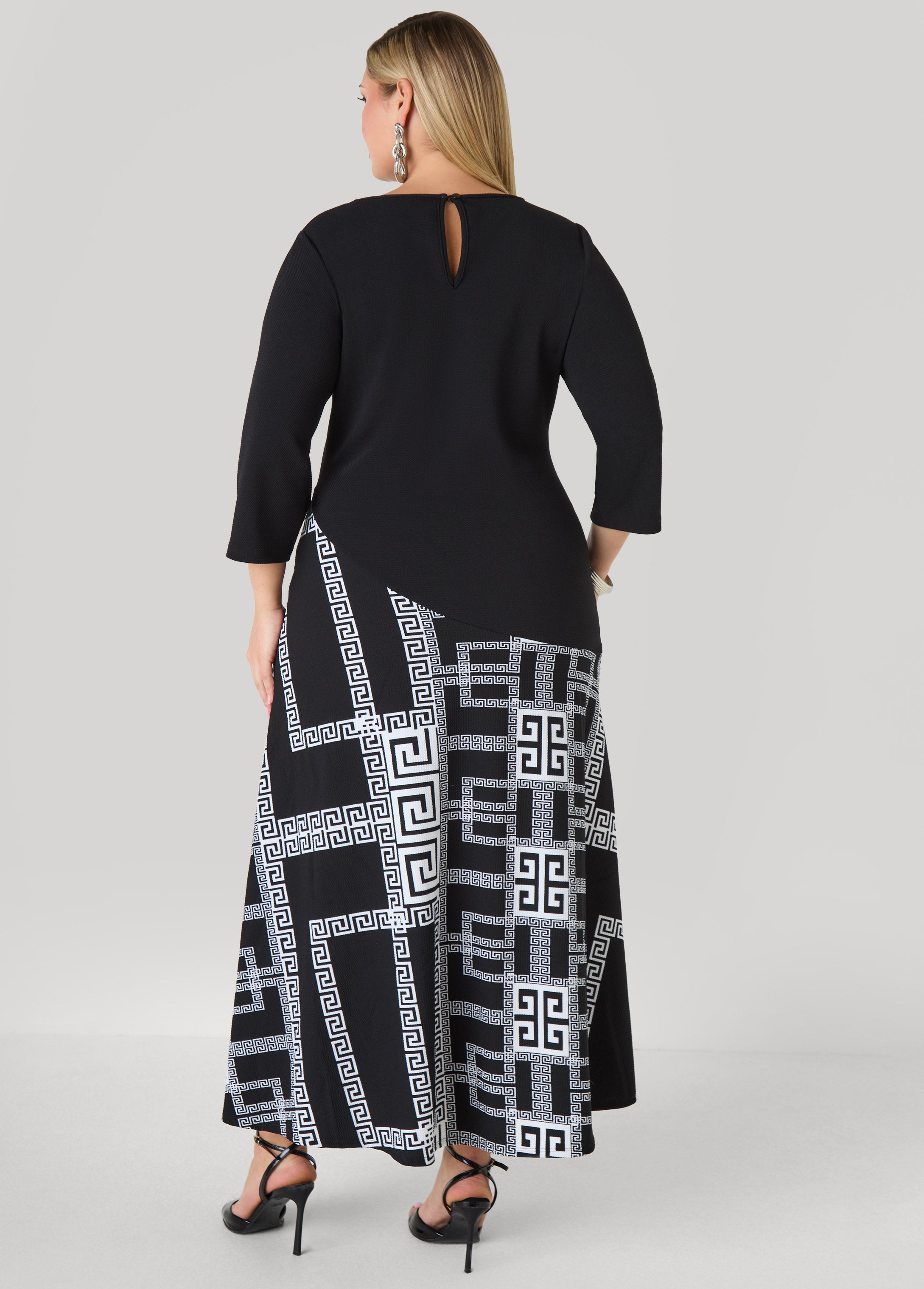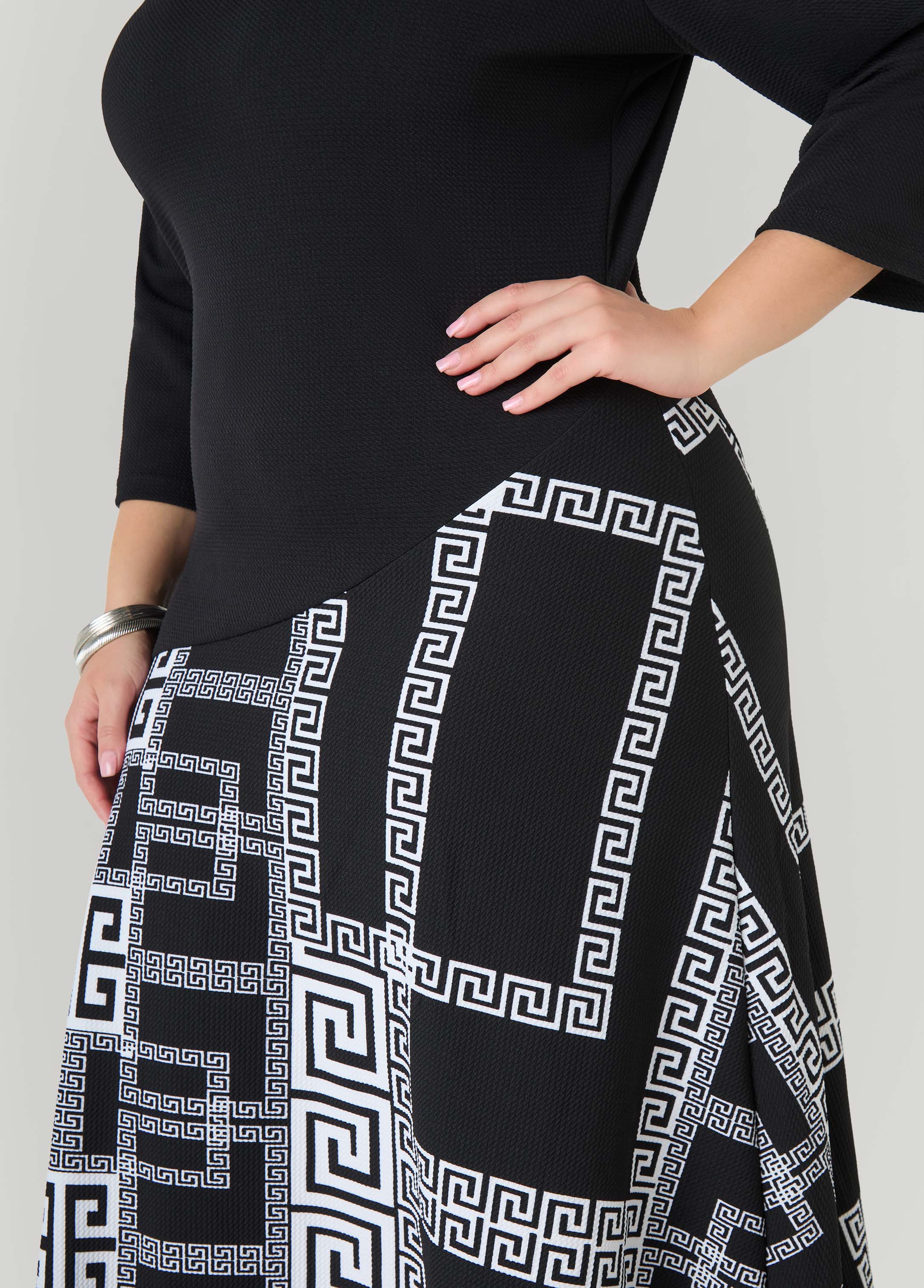 This maxi pulls up ready for its moment. The textured-knit drapes with confidence from shoulder to hem while the Greek key print brings art to the fabric. It’s an easy yes for nights out, big plans or any scene where you want the room to know you’ve arrived.