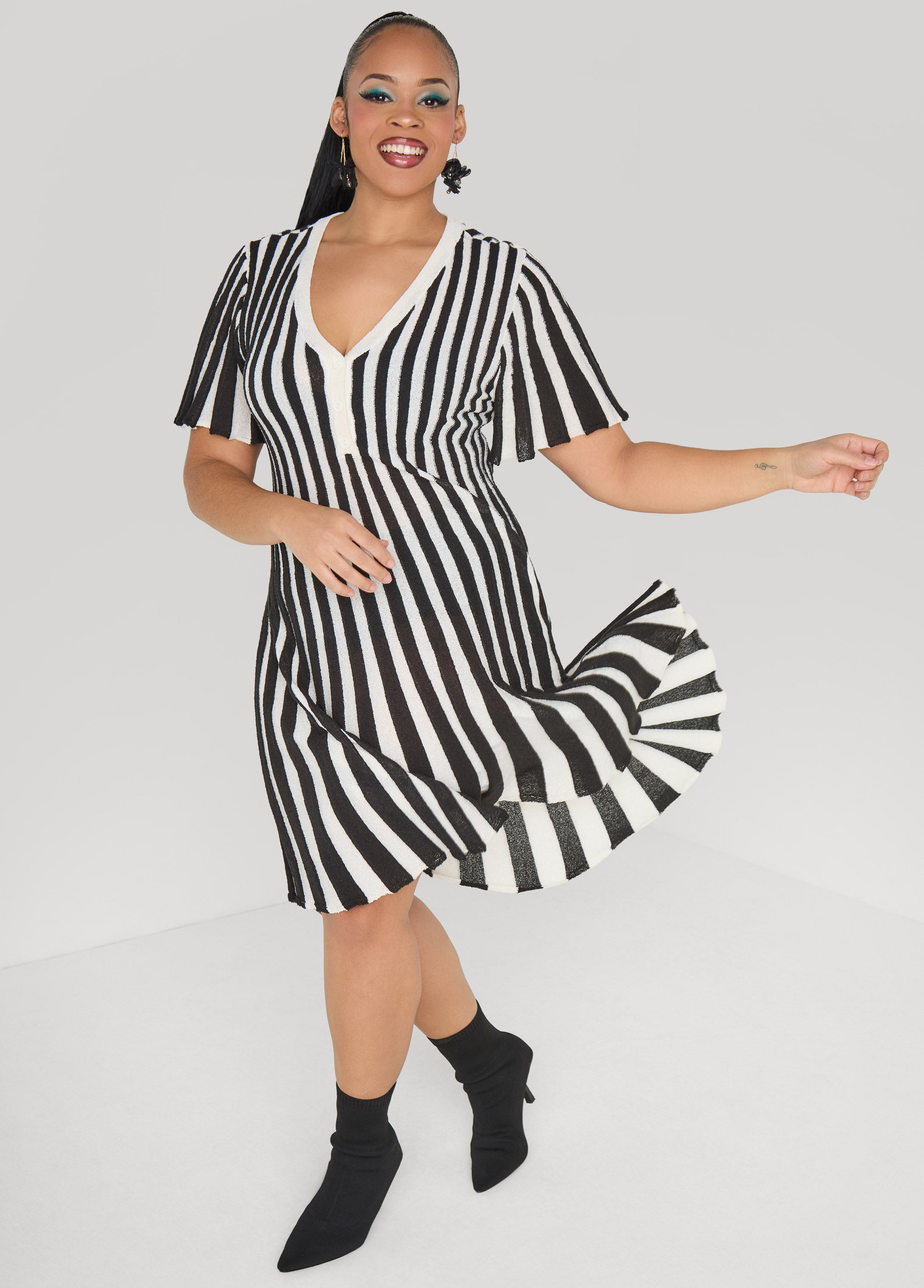 This striped bouclé sweater dress plays it close with a body-skimming fit and and button detail. The A-line skirt keeps things balanced giving you a look that feels confident & sexy.
