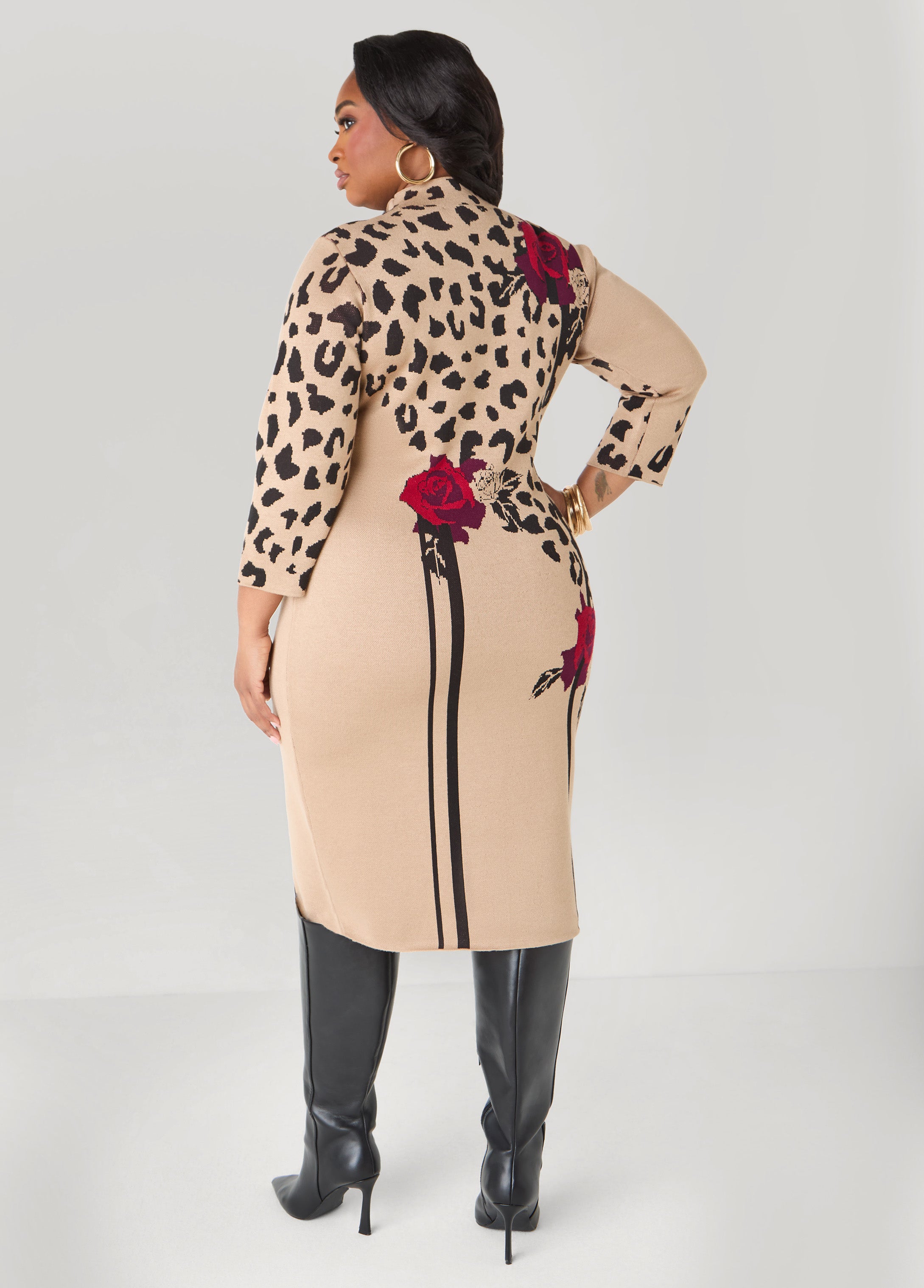 Softly sculpted and flattering, this intarsia-knit sweater dress blends leopard and rose motifs for a flirty, feminine feel. The mock neckline adds subtle sophistication to a piece made to make an impression.