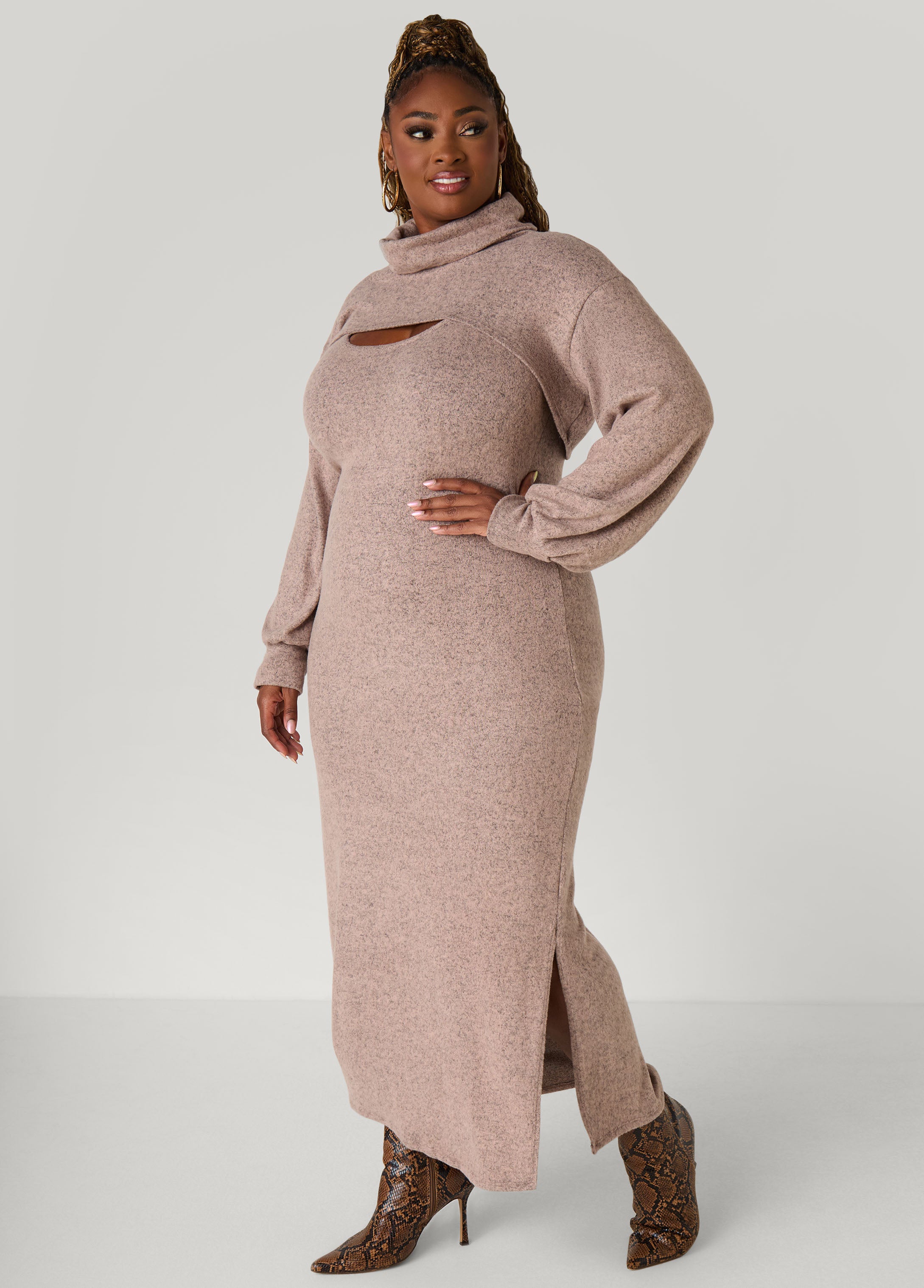 Our cropped marled-knit turtleneck eats every time. Pair it with the tank dress and you’ve got the set that shuts it down.