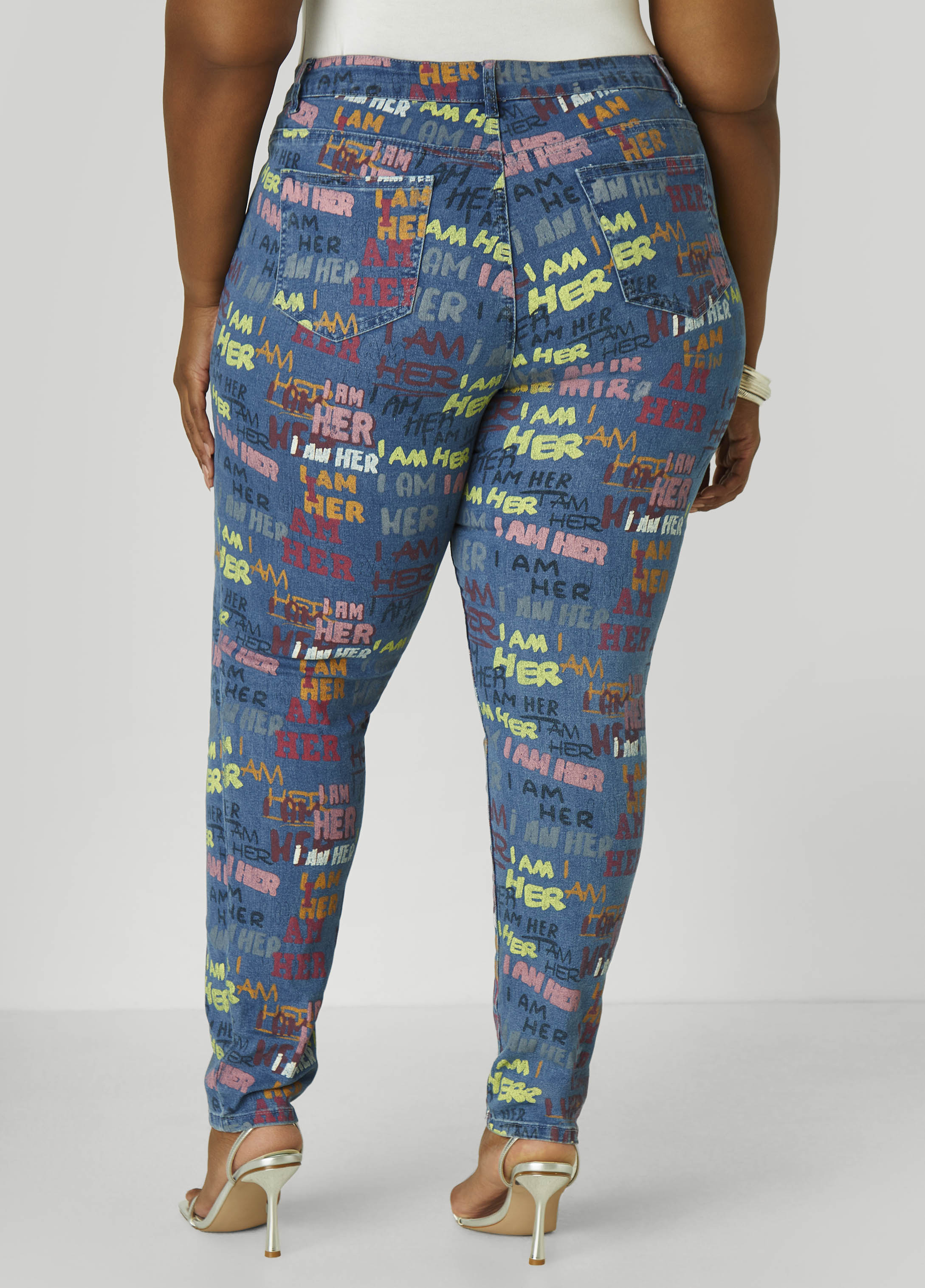These high-rise skinnies keep it loud with allover “I Am Her” print and stretch-denim that hugs just right. Wear them with the matching vest and let the whole fit do the talking.