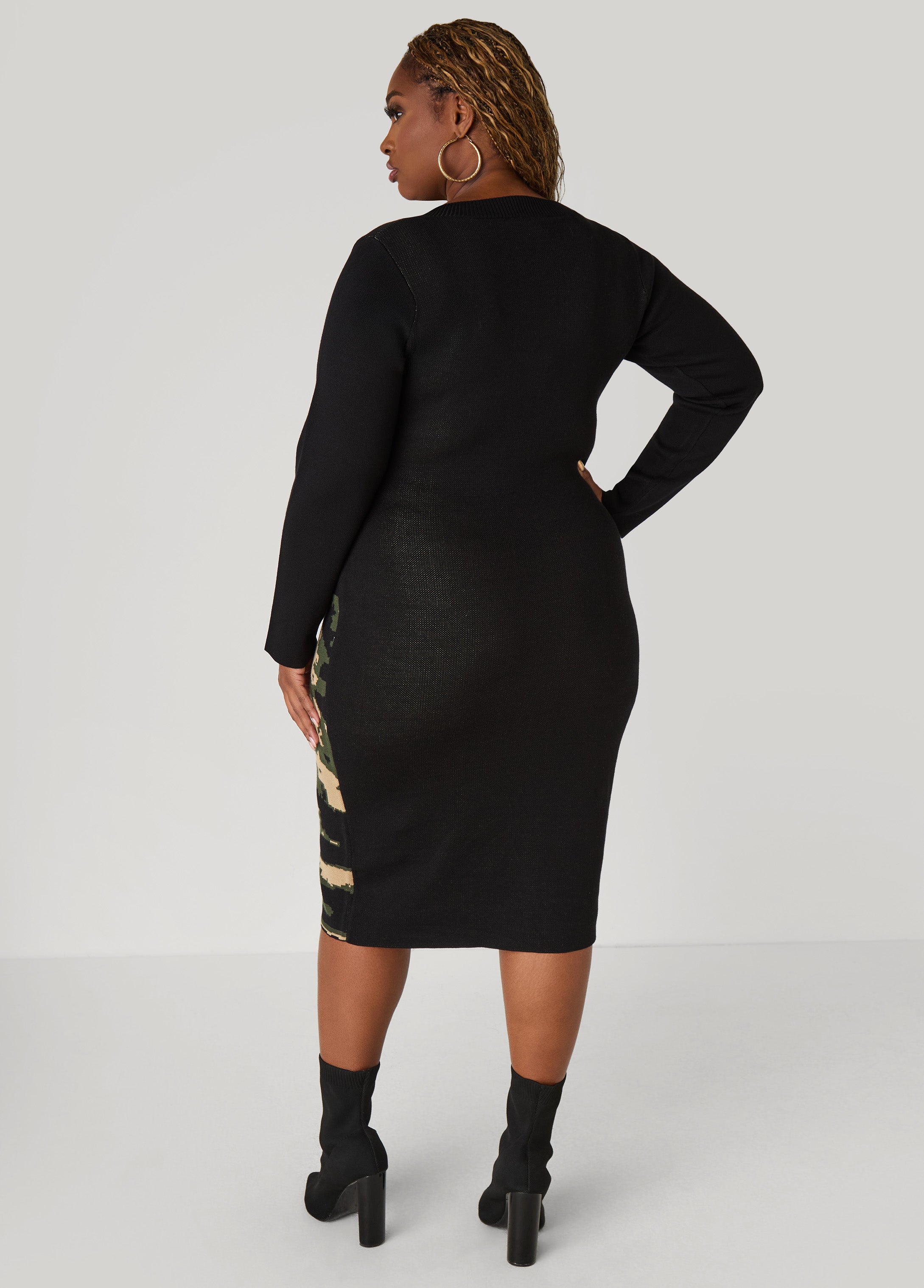 This intarsia-knit sweater dress turns the classic camo design into a statement piece with its deep V-neck and sleek slip-on silhouette. Effortless knitwear that reads runway-ready.