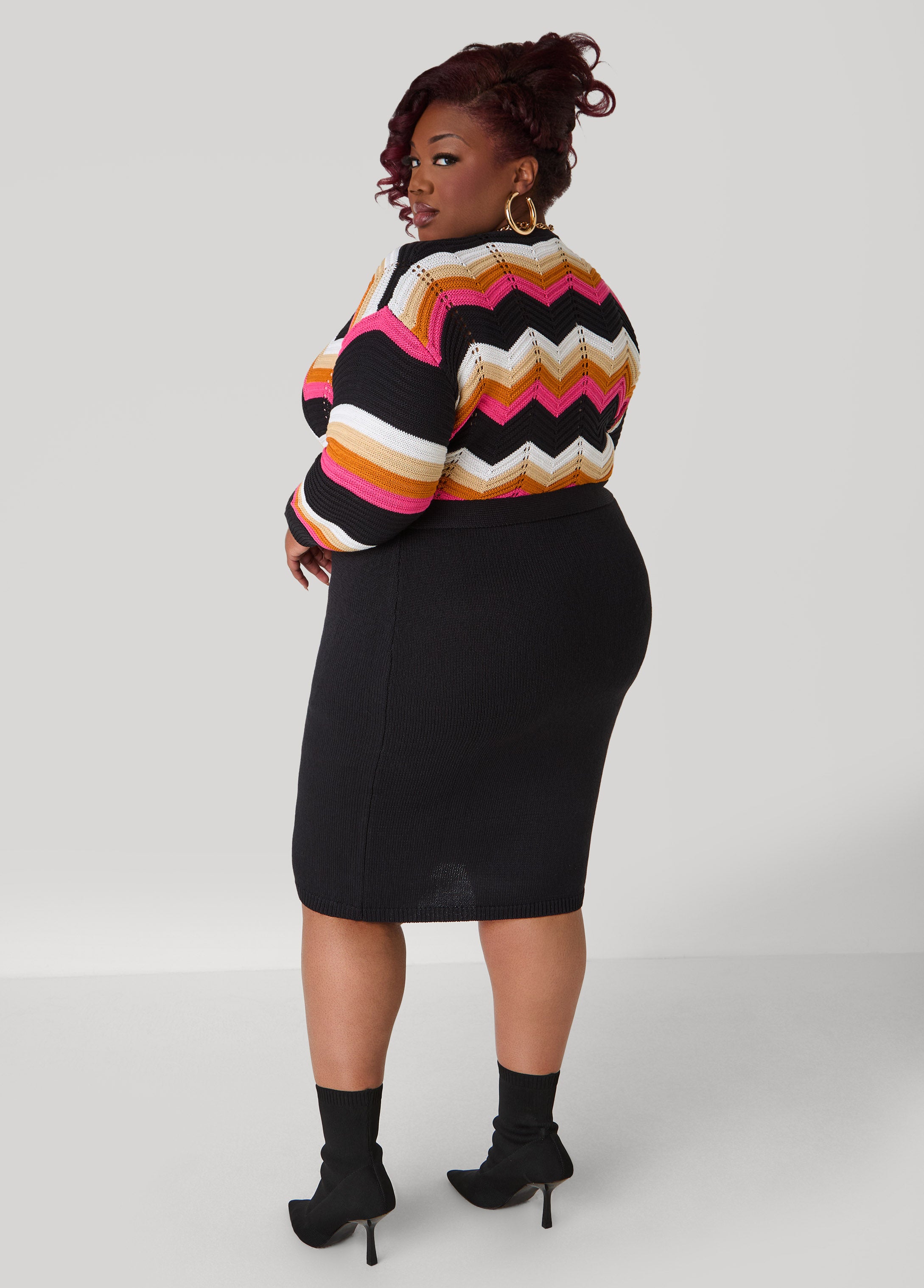 Chevron stitches give this sweater dress its edge. A V-neckline keeps it sleek and sash ties pull the waist for a look that’s all figure and flair.