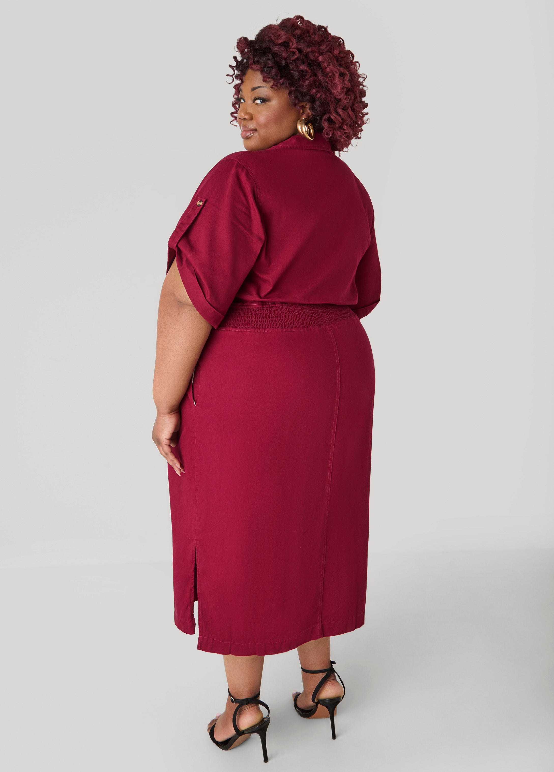 This midi denim dress features a shirred waistband that shapes without fuss. Side slit pockets hold your must-haves or whatever else you stash. Button tabs on the cuffed sleeves let you adjust the style on the fly.