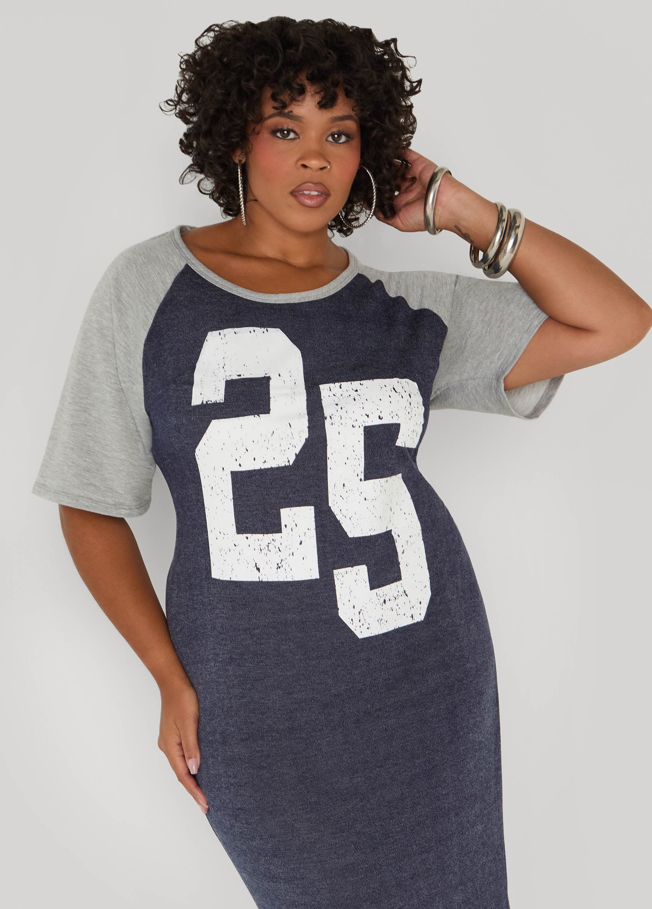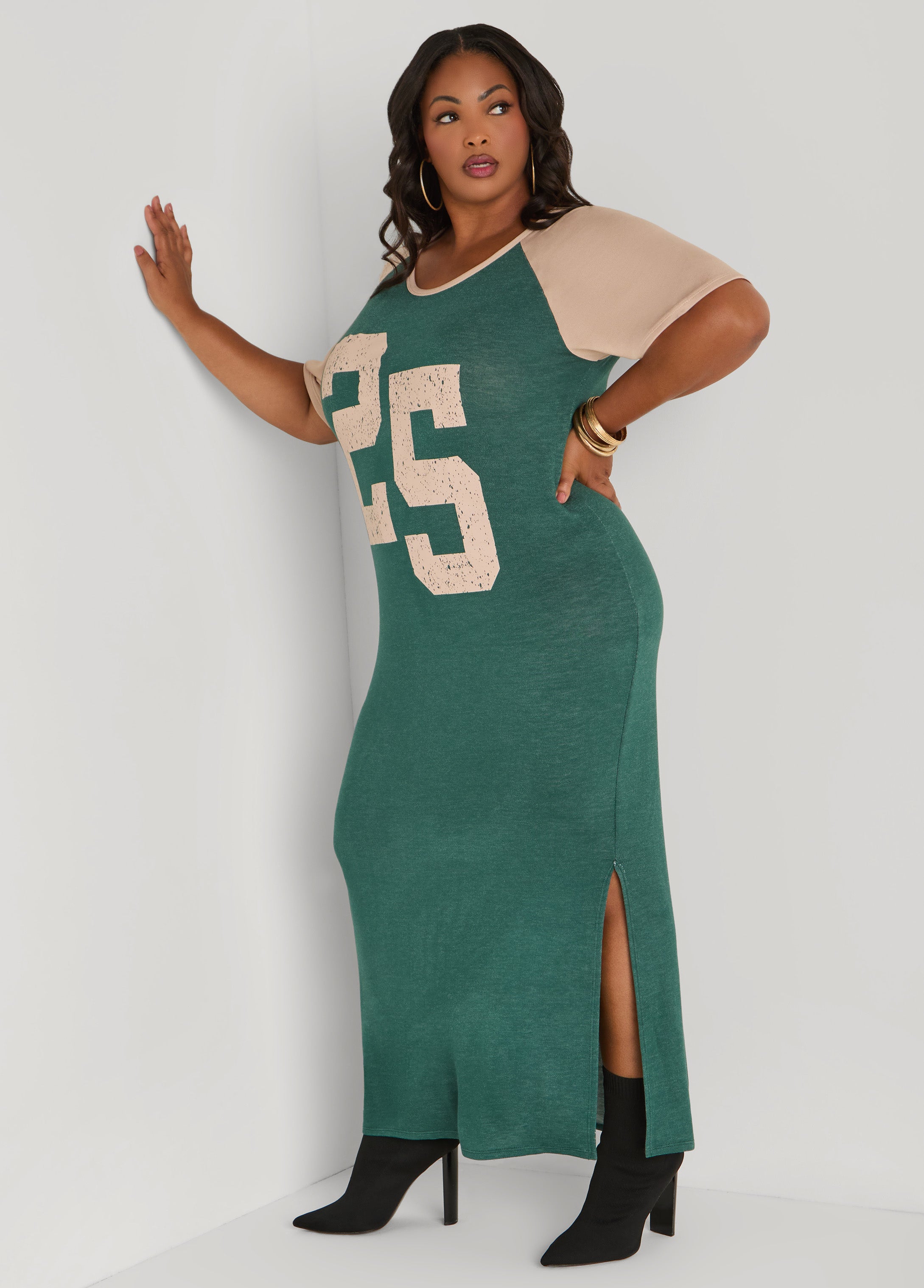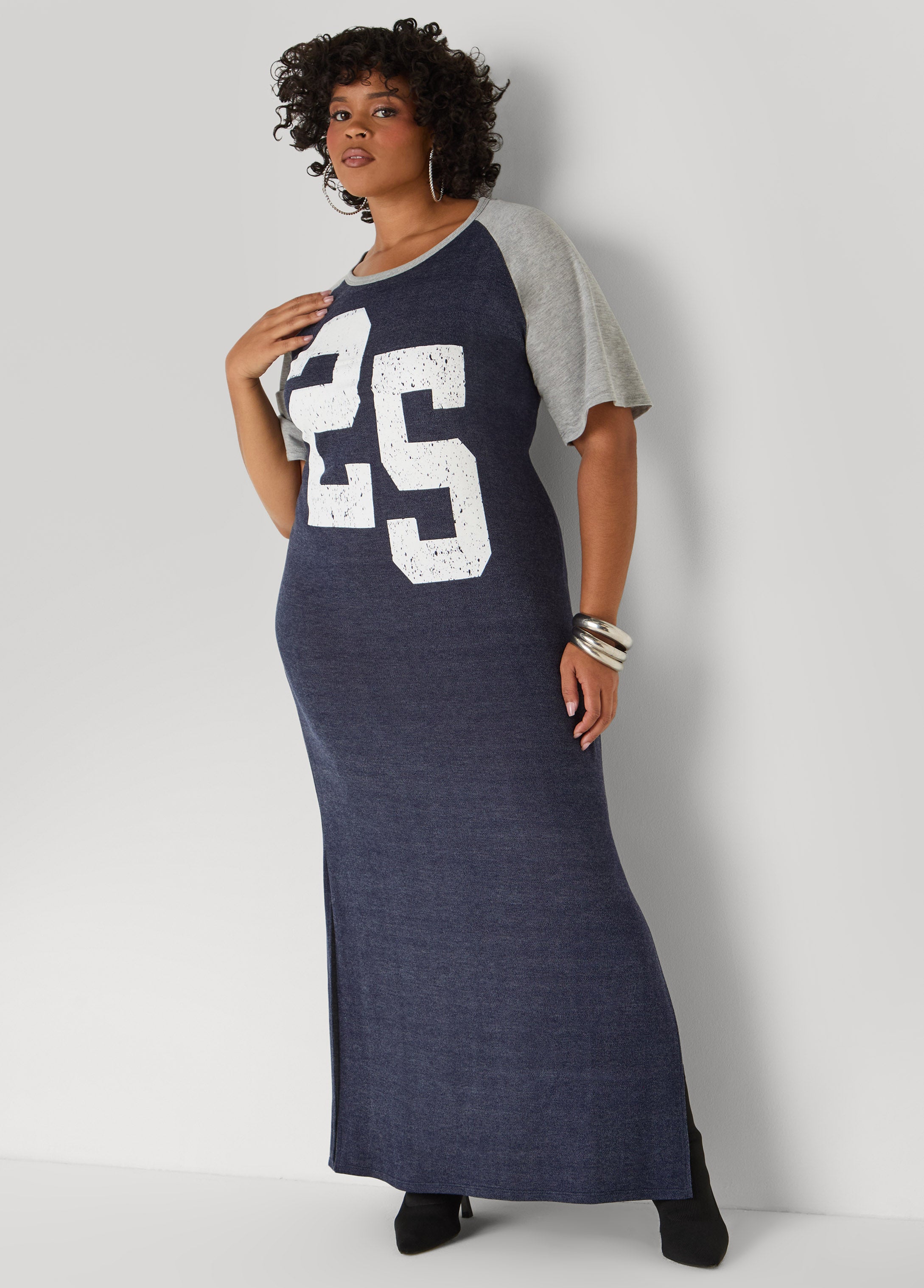 Game-day energy, but make it sexy. This jersey-style two-tone French terry maxi rocks a bold “25” up front with side splits that bring the drama.
