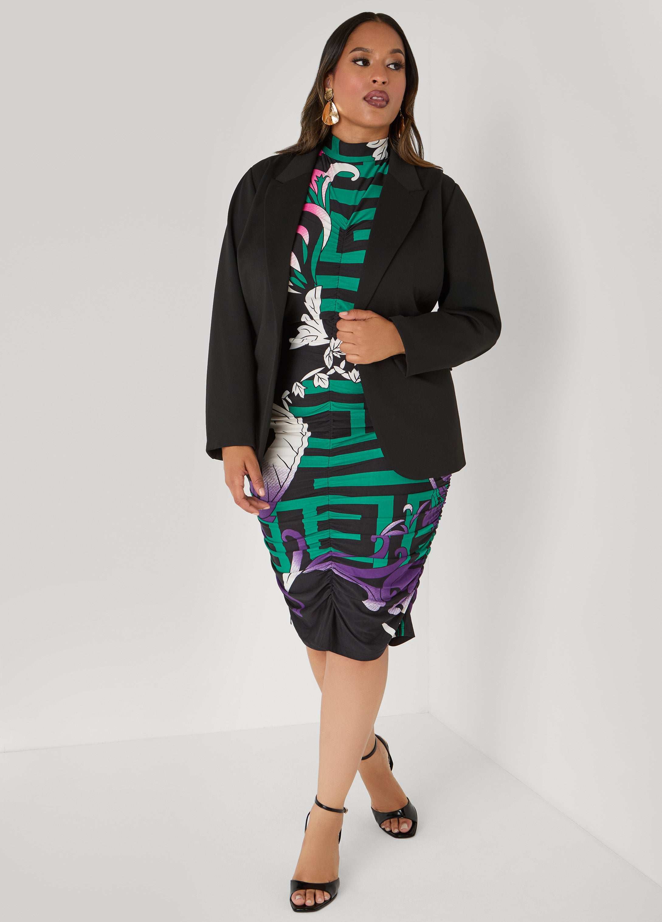 This Greek key and floral print bodycon knows how to work it. With ruching that teases every curve & a mock neck that keeps things fresh, you’re set to turn the party all the way up.
