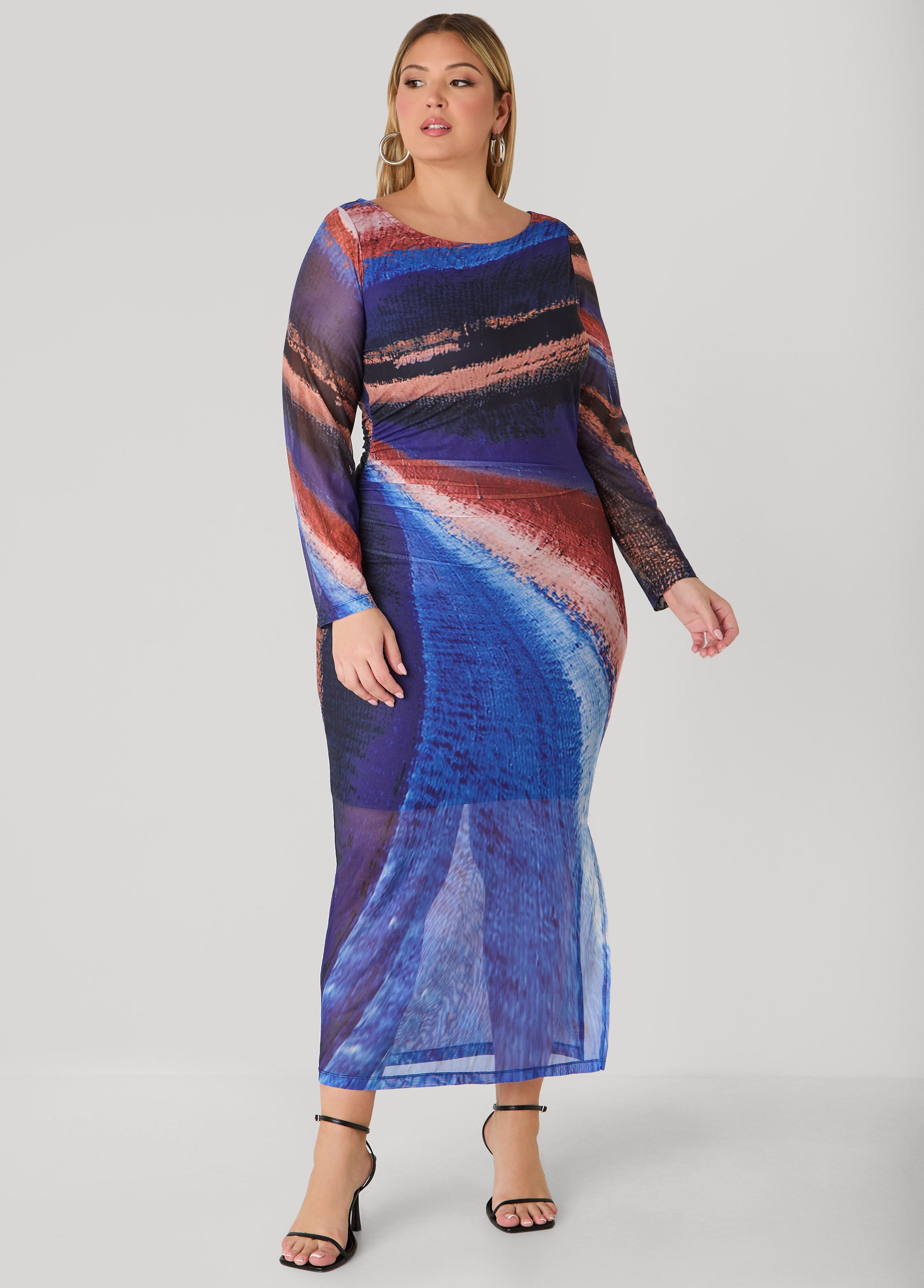 Plus Size Printed Mesh Bodycon Maxi Dress