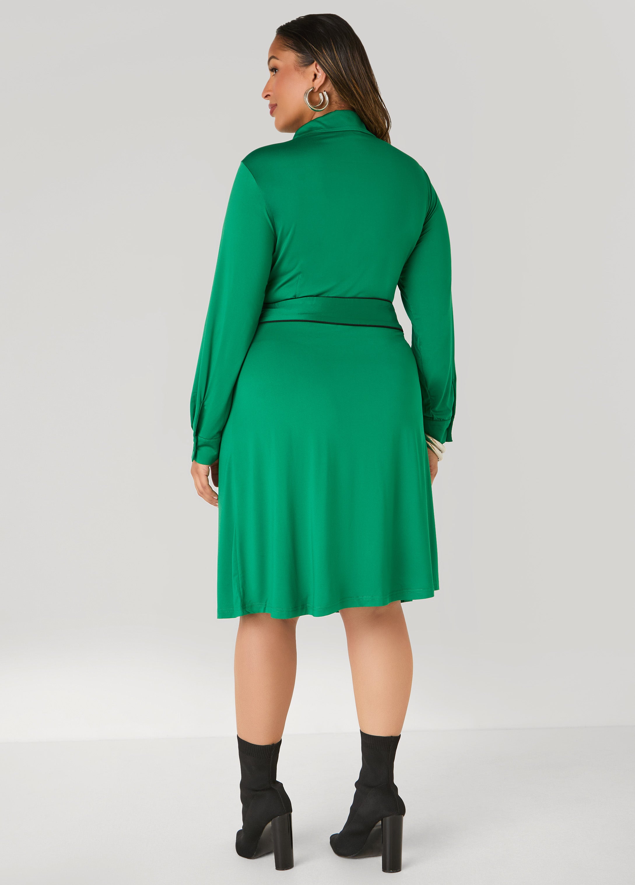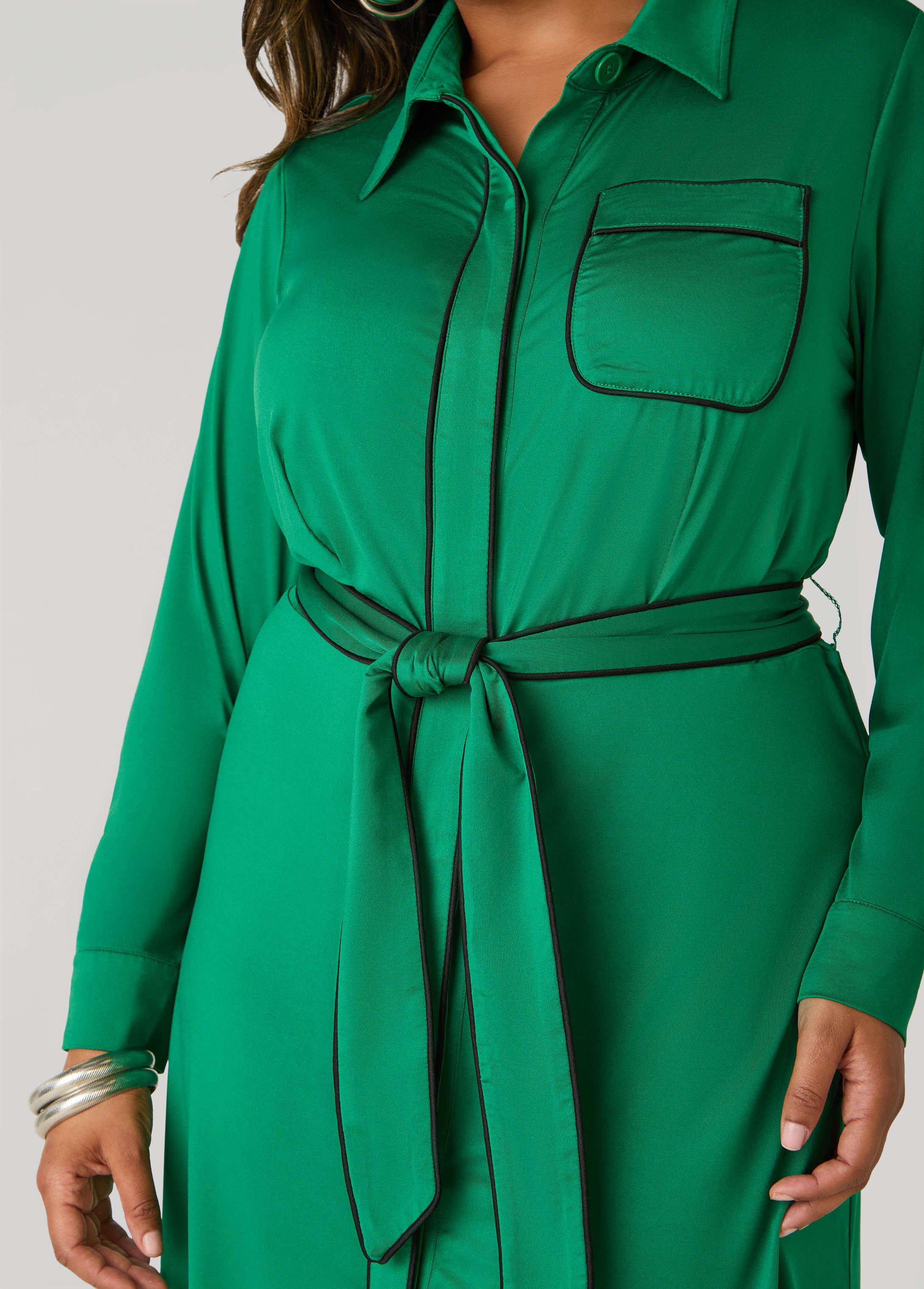 Go green and go bold. This stretch-knit shirtdress serves a patch pocket at the bust, button-fastening sleeve cuffs, and contrasting trims that catch the eye. Sash-ties at the waist let you cinch it in for a look that’s full of fresh energy.
