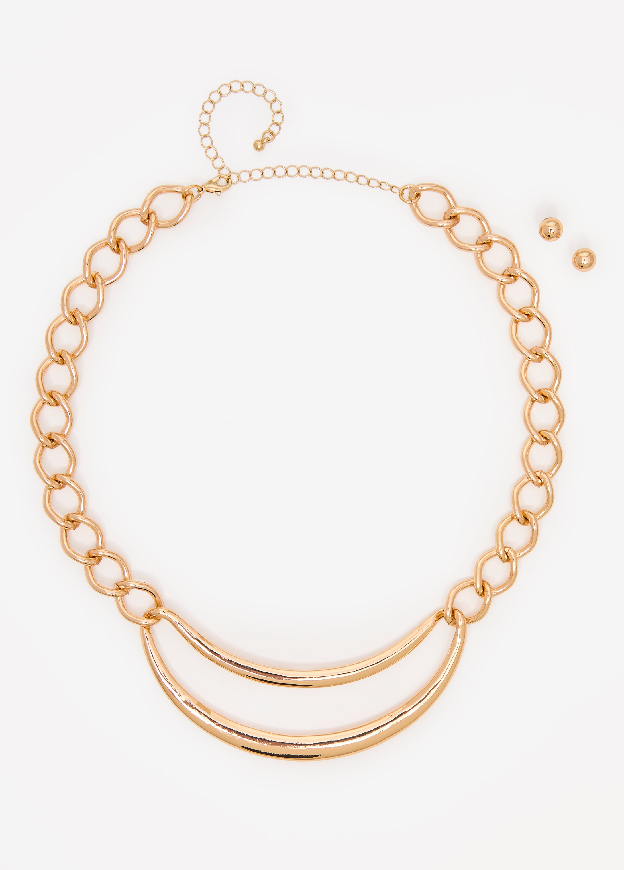 A cutout moon pendant defines this necklace with a clean, modern glow. Finished with matching stud earrings and offered in gold-tone or silver-tone metal, the set delivers a refined look with celestial appeal.