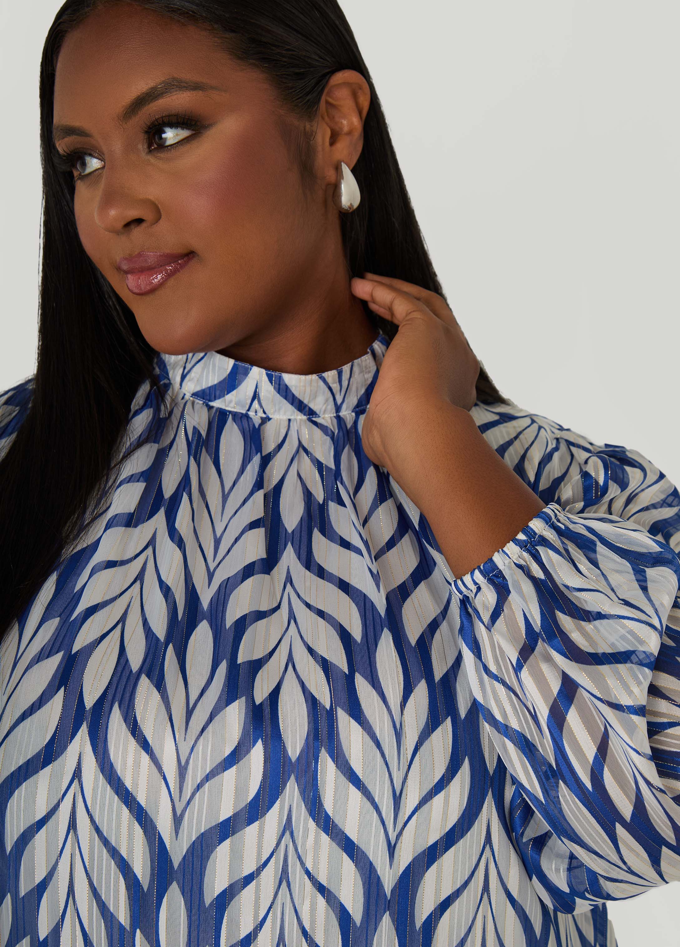 Leaves are falling for this chiffon and satin-twill blouse. Mock neck, sparkling gold threads and an elasticized waistband give it shape while the print does all the talking.