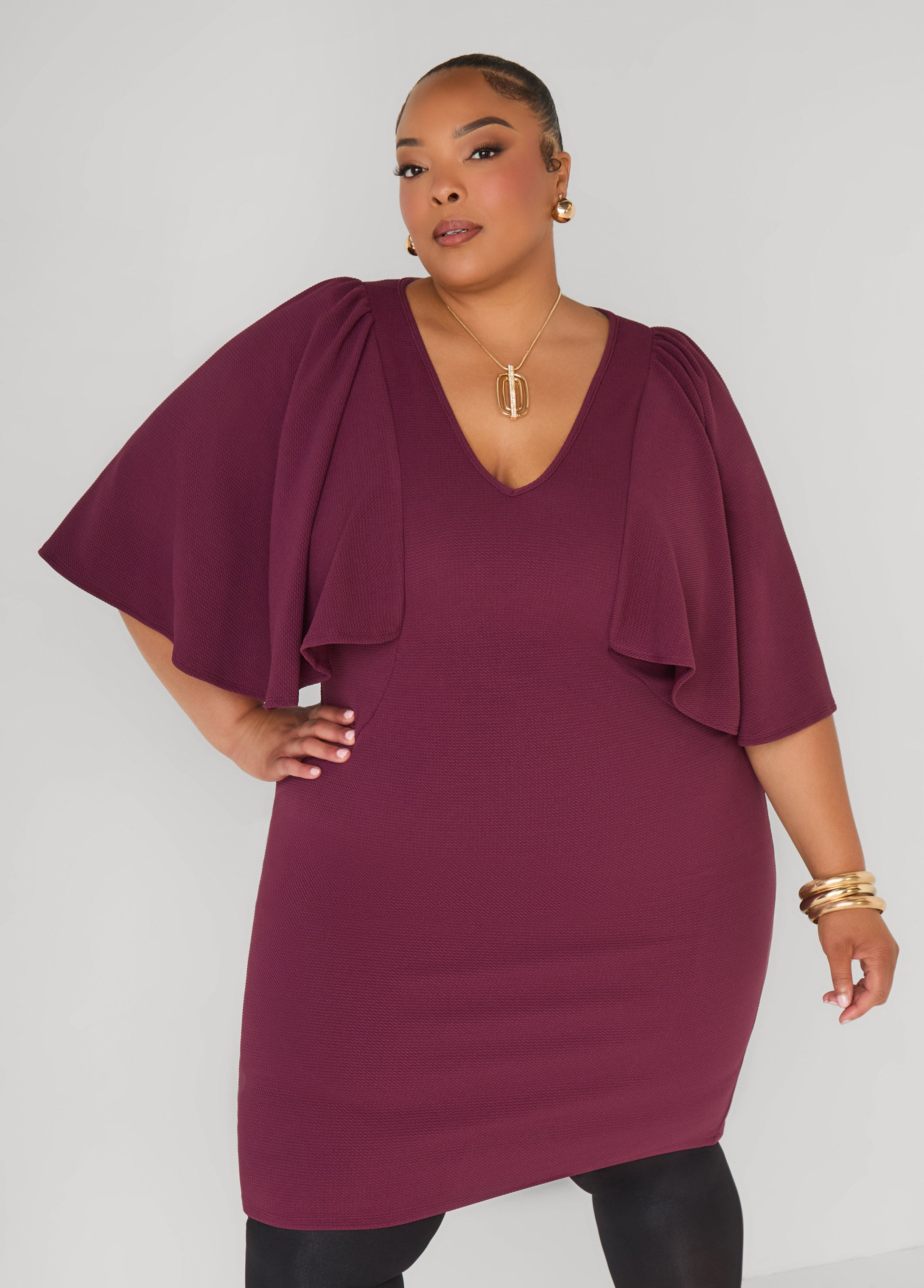 Make way for a textured-knit sheath that knows how to show off. The V-neck serves up just enough sass while cape-effect sleeves bring all the drama. Desk to dinner, it’s your power move in dress form.