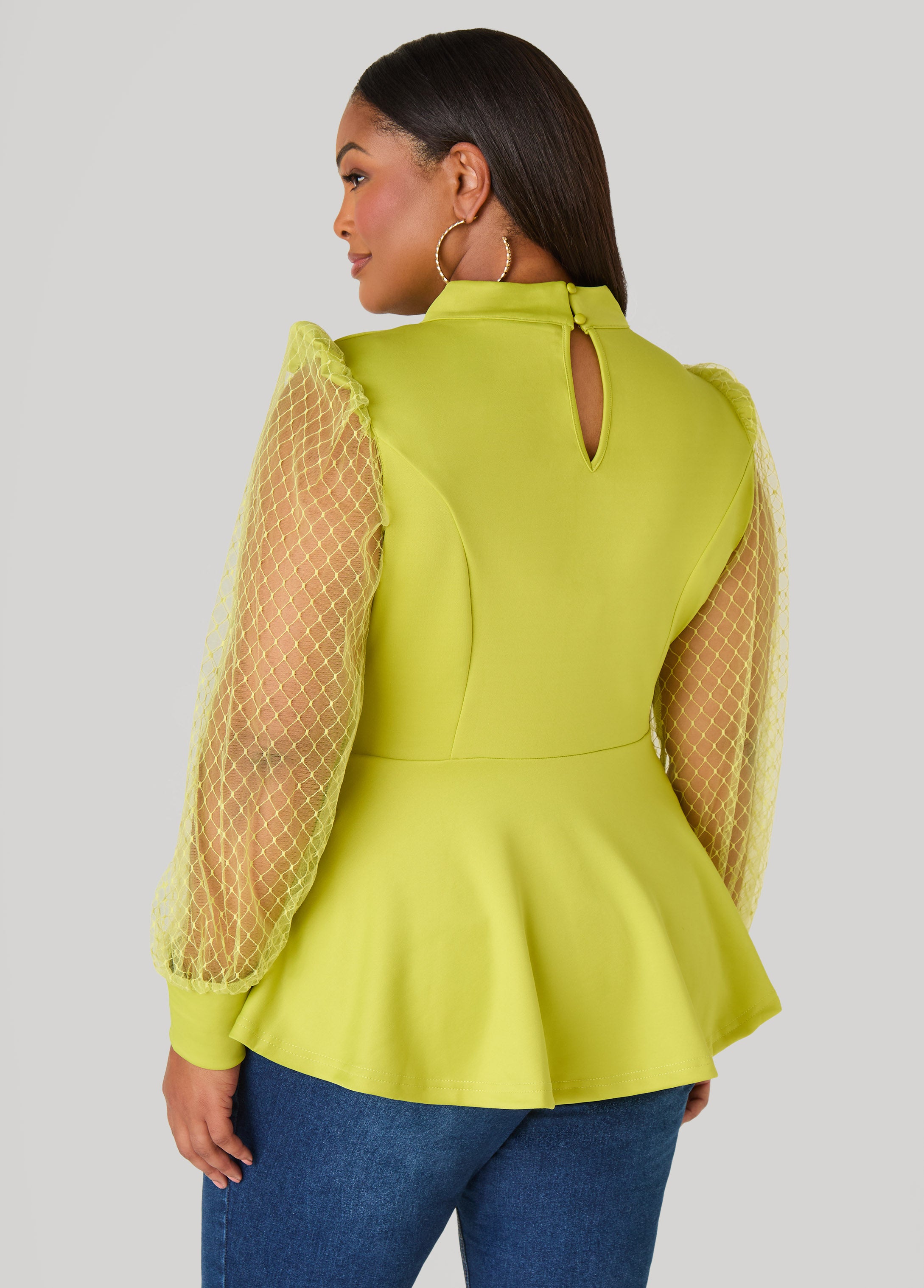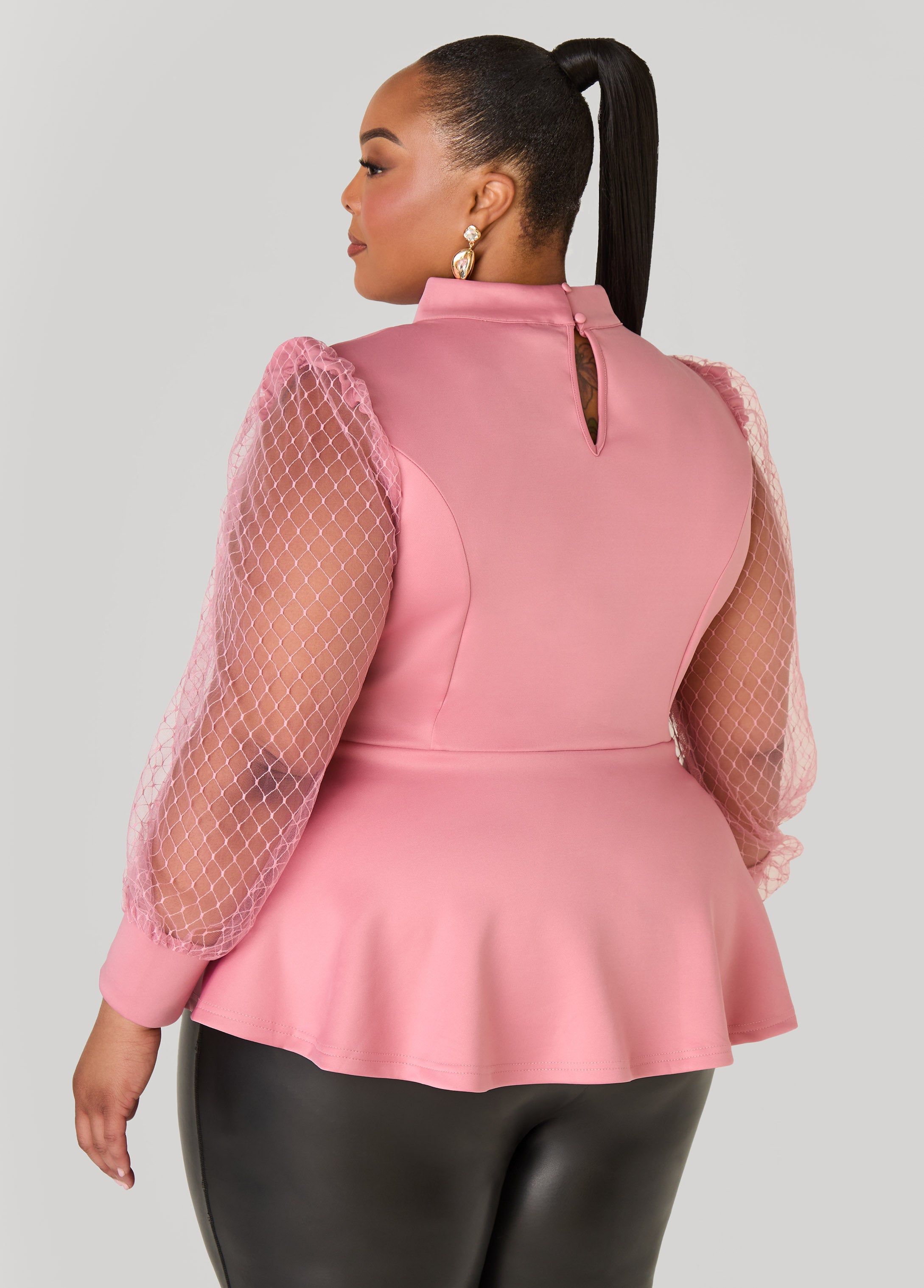 A scuba top that plays by its own rules. The mock neck & cutout turn up the sexy while embroidered mesh sleeves keep things intriguing. Finished with a peplum waist that’s all about the power pose.