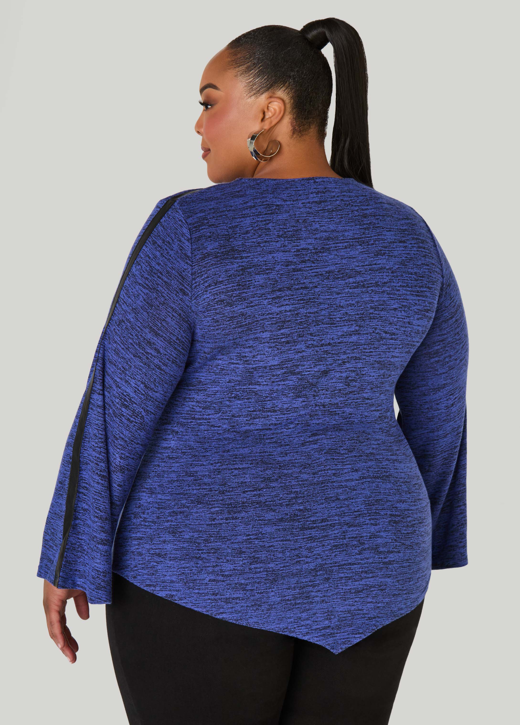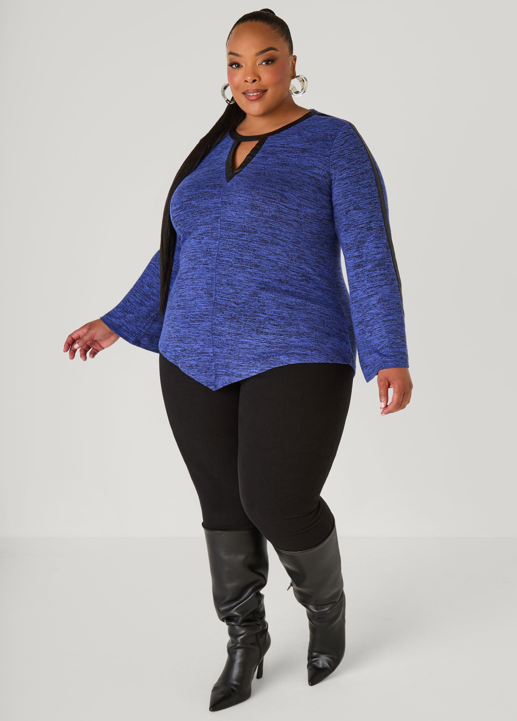 Not your average knit. Marled fabric is balanced by faux leather trims with a daring cutout & sharp V-cut hem.