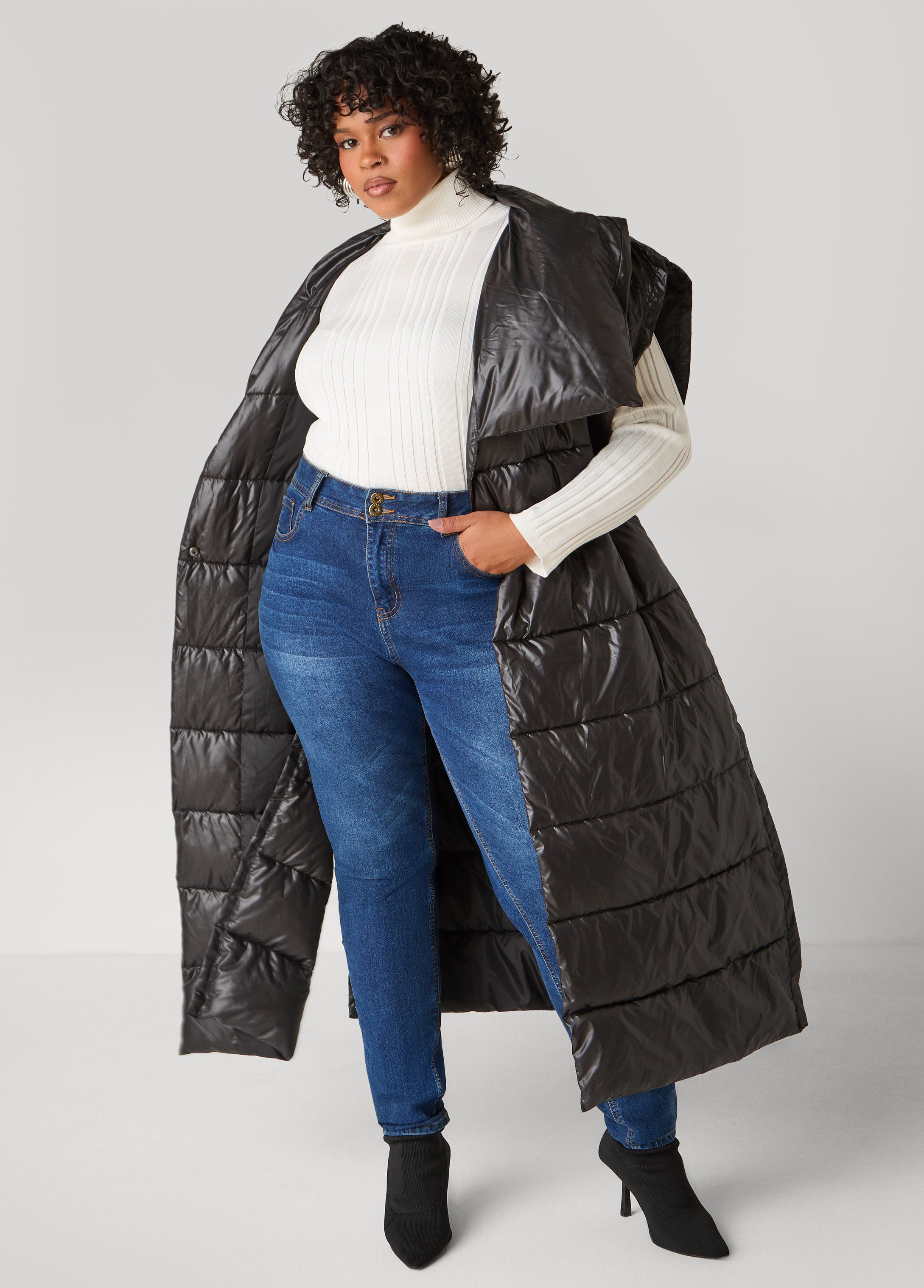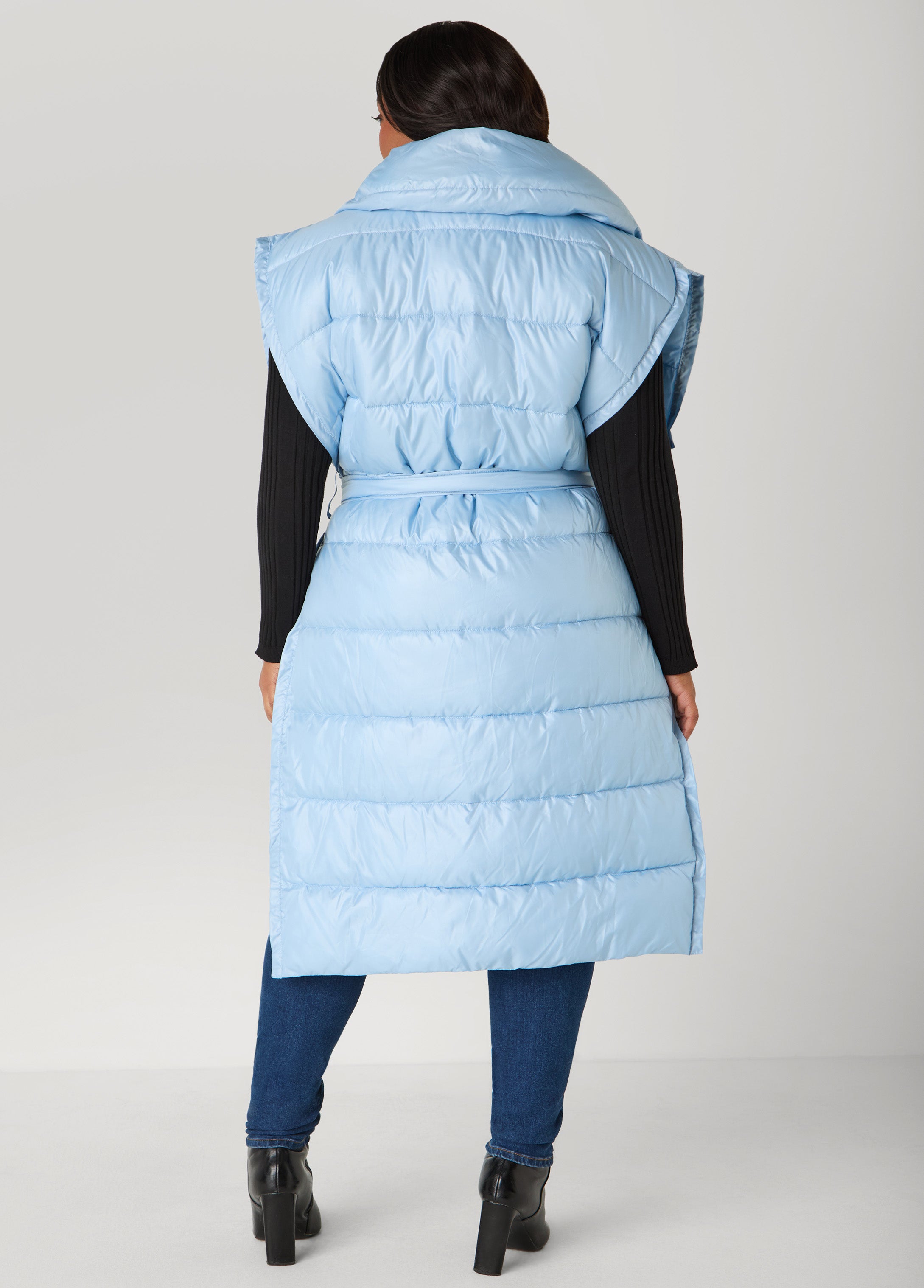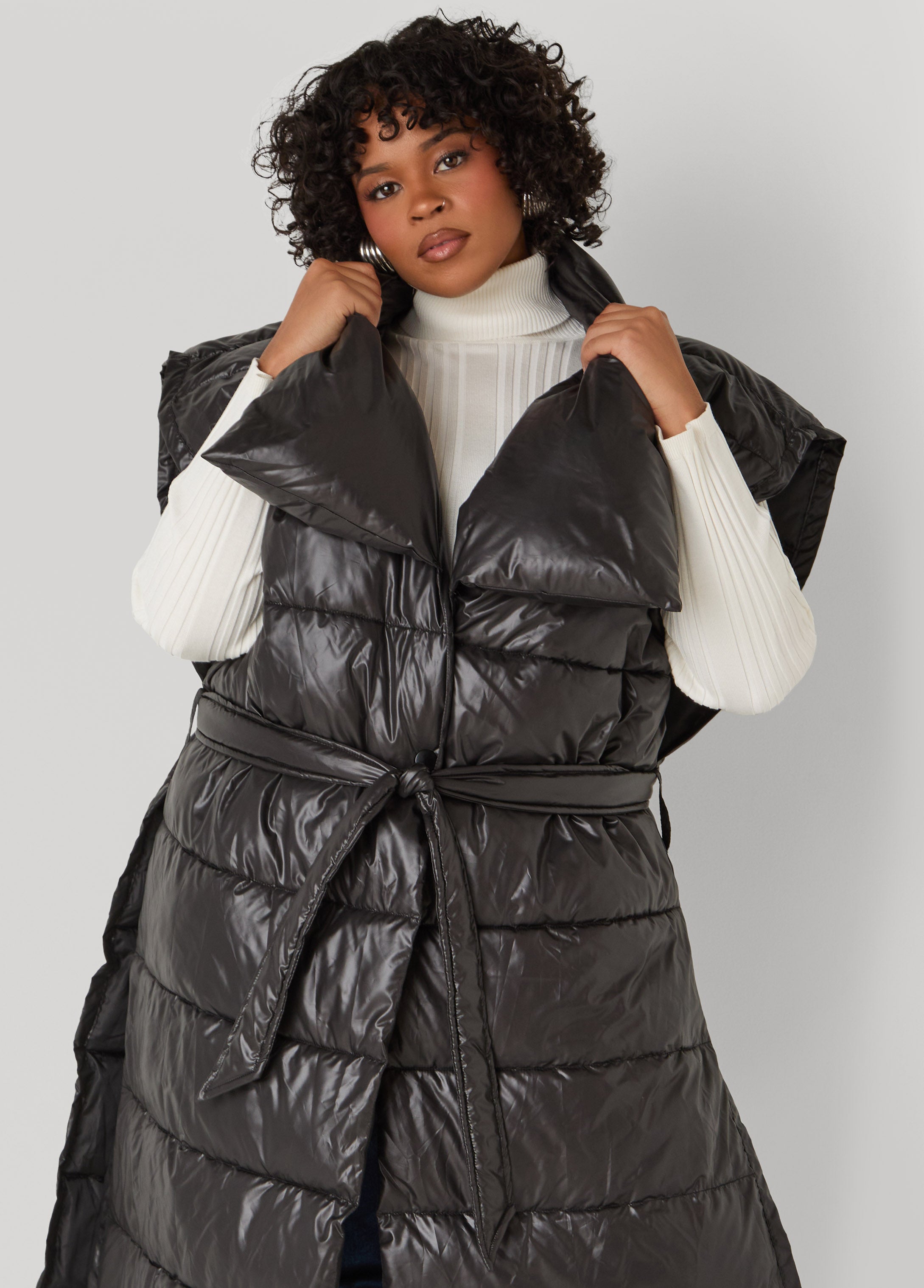 Drama served extra-large. This full-length puffer vest sways with side splits and cinches with sash ties giving oversized a whole new level of slay.