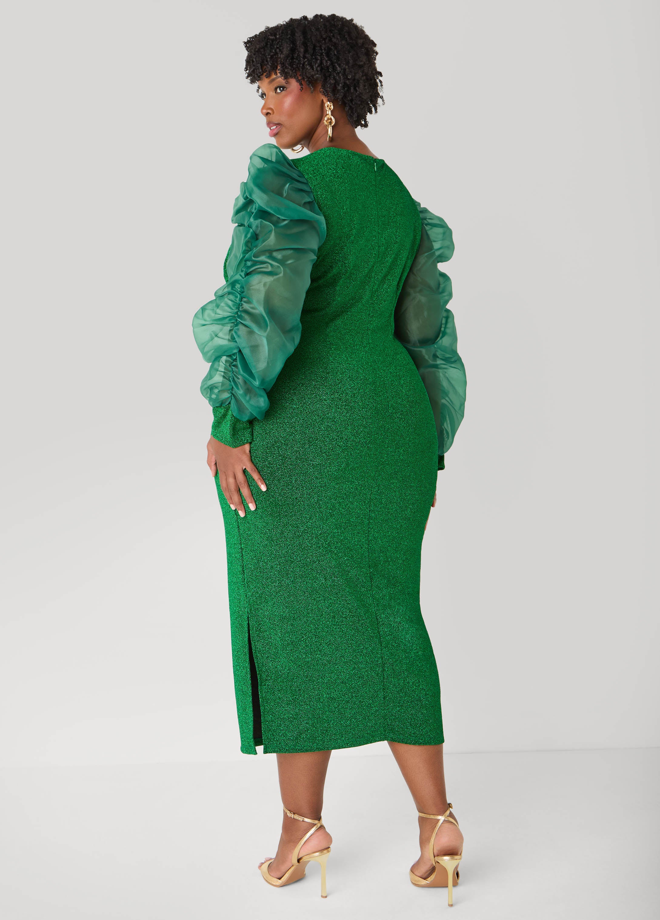 Bring the sparkle, skip the subtle. This Lurex™ knit bodycon dress turns every holiday moment into a main event with gathered organza sleeves and a leg-flaunting side slit.