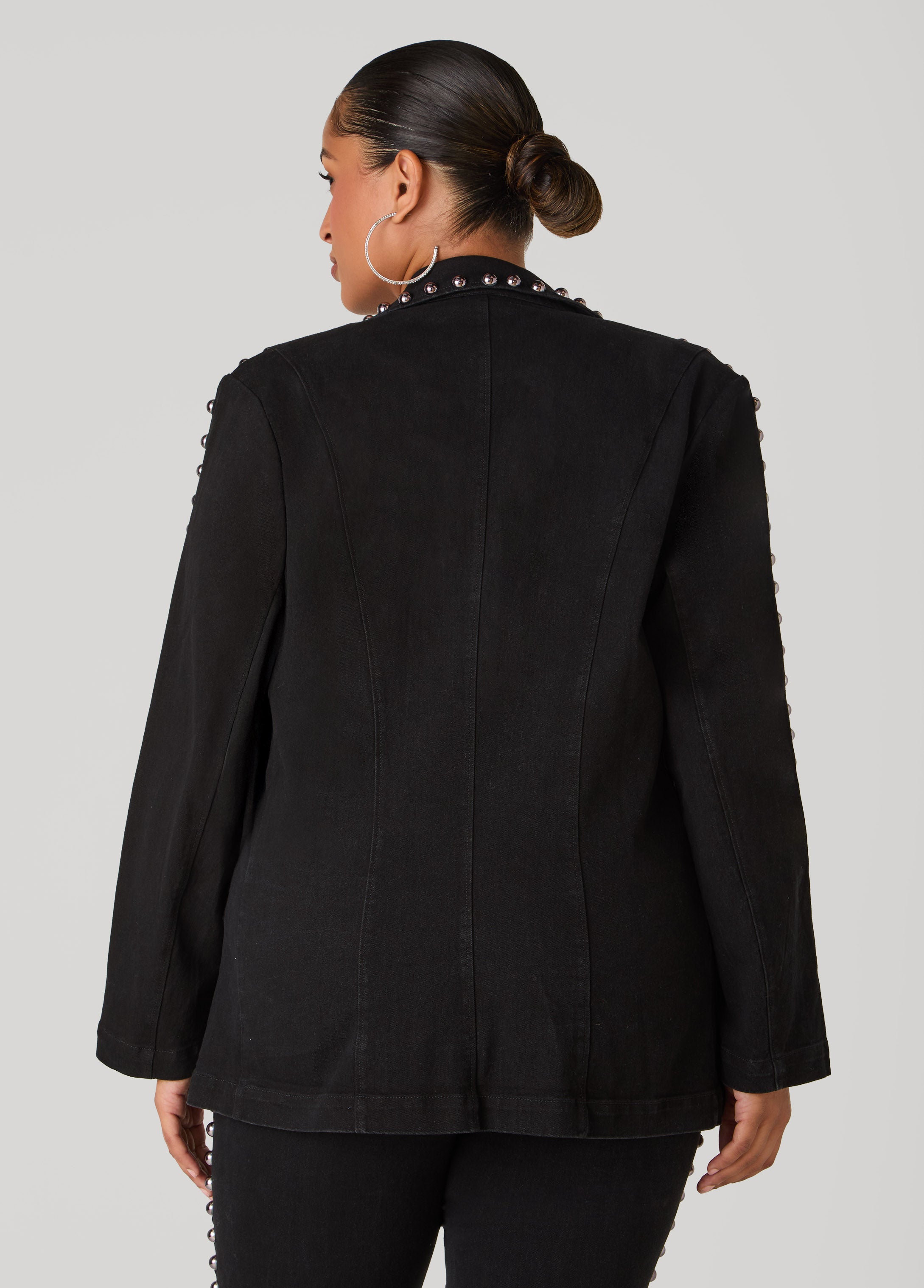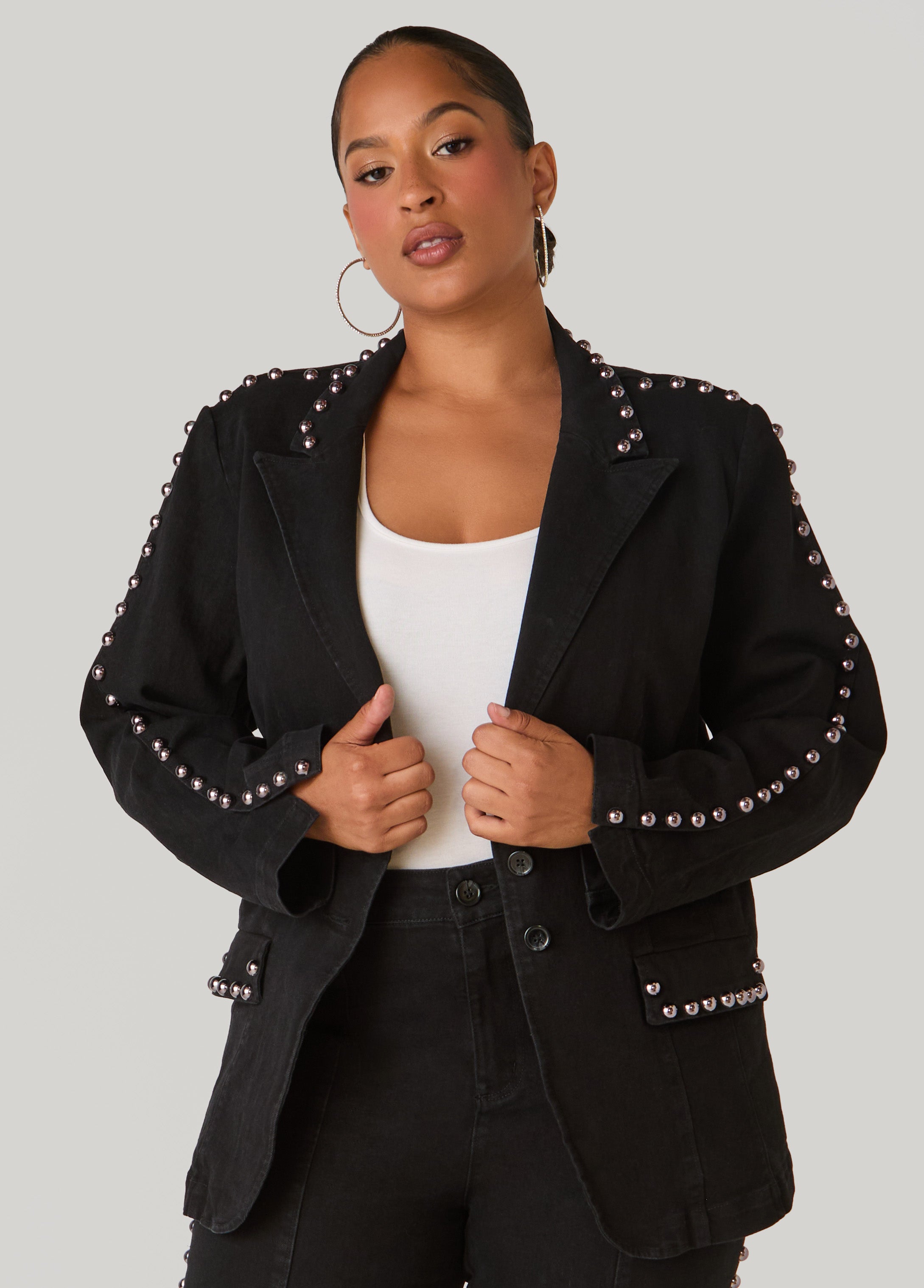 Studs embellish this chic denim blazer that elevates its look especially when paired with the matching jeans for a sexy, head-turning two-piece set.