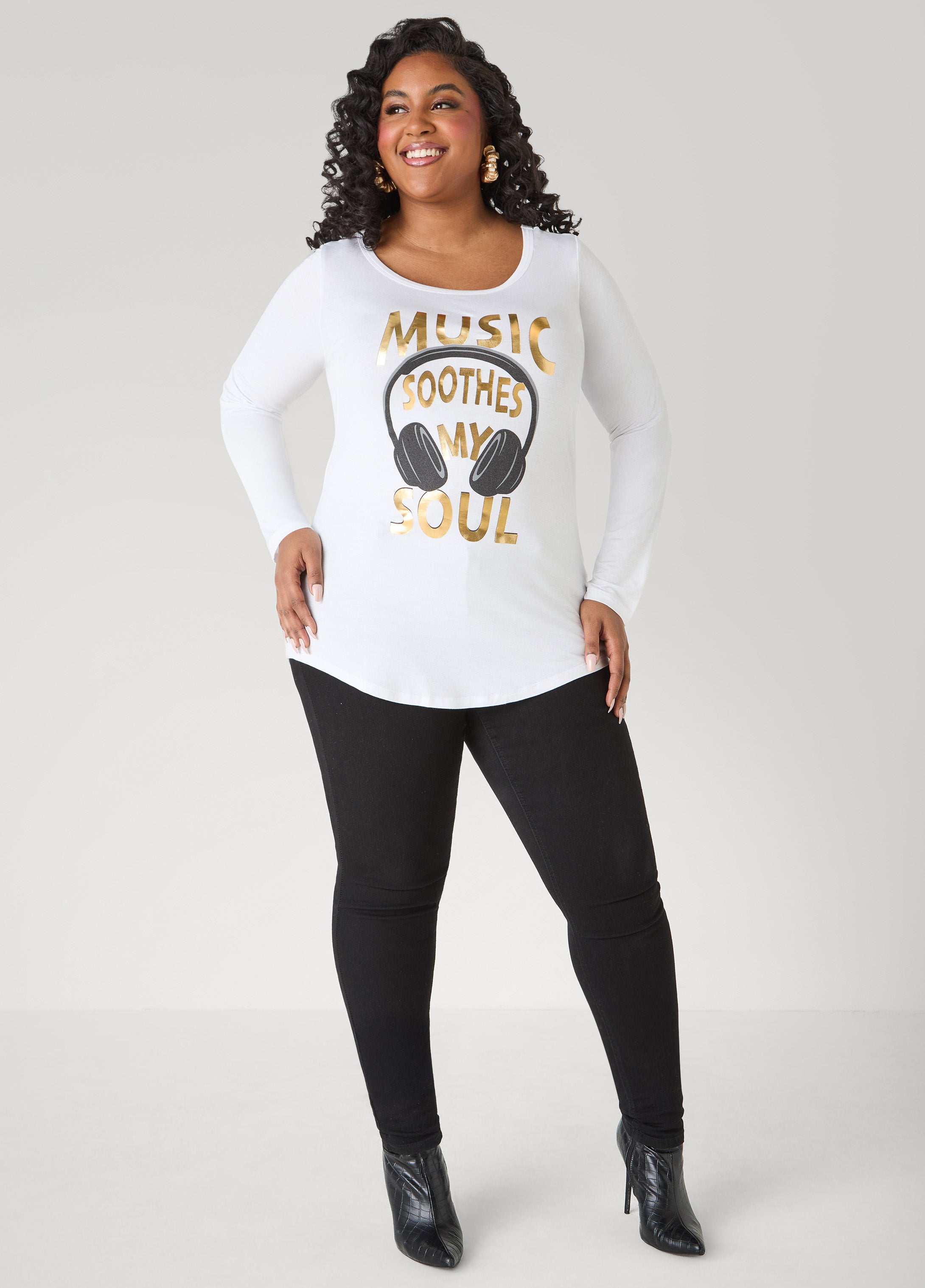 “Music Soothes My Soul” on this tee with metallic lettering that turns up the vibe & long sleeves that make it the perfect pick for when your playlist is attuned to your spirit.
