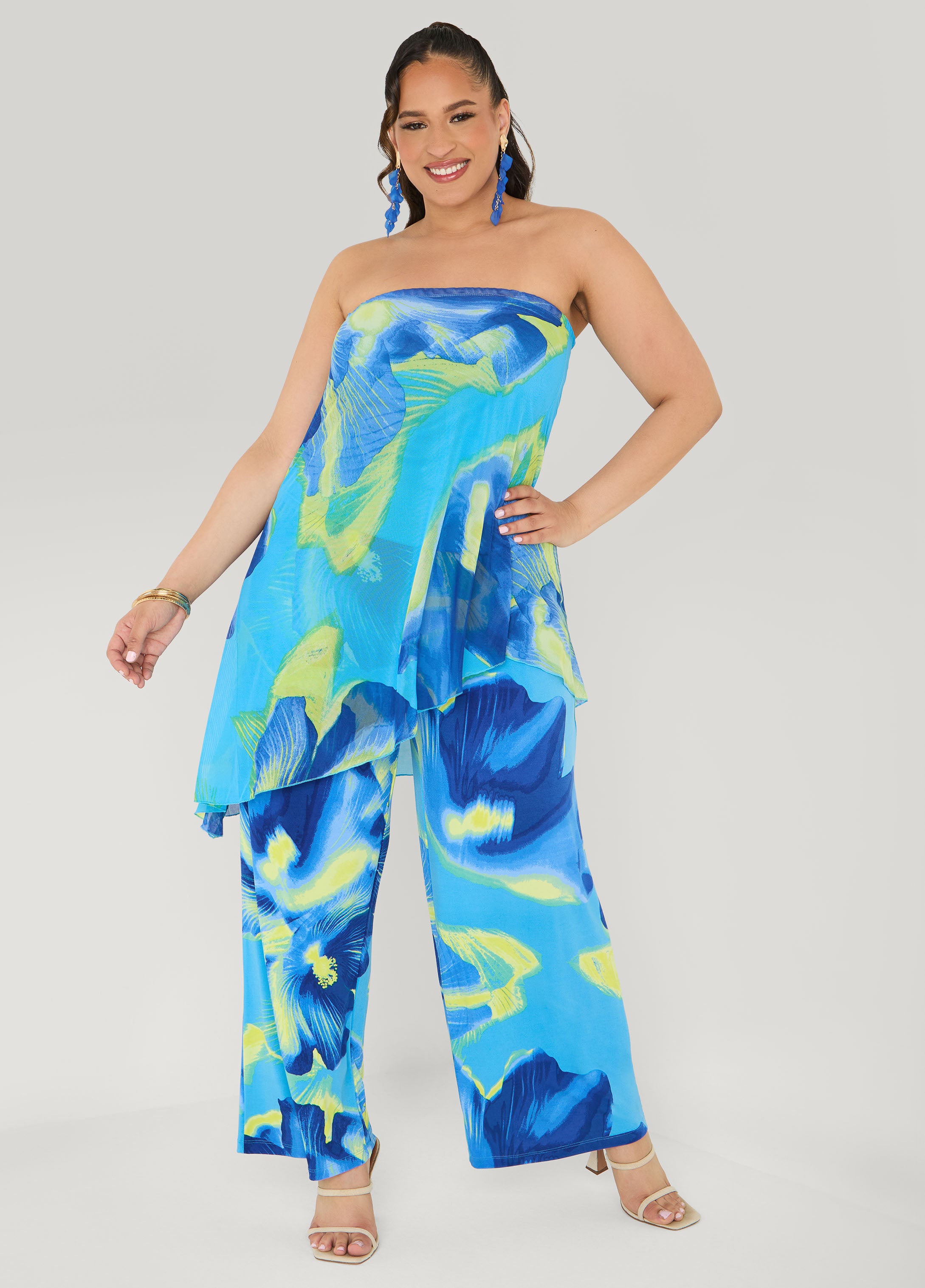 A vivacious blue and green tropical print ripples across these wide-leg pants, cut for a relaxed, flirty fit. Pair them with the matching tube top for a sexy two-piece set made for summer escapes.