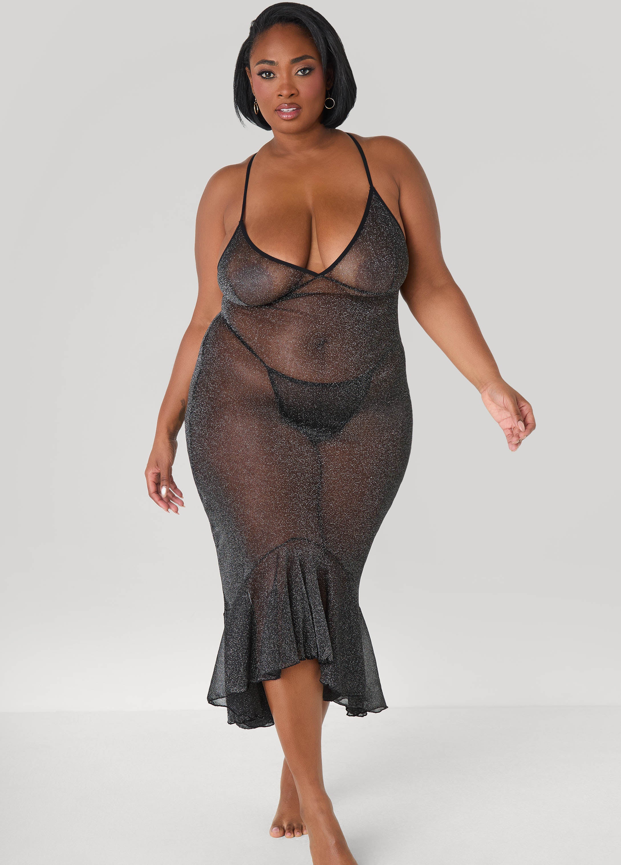 This metallic stretch-mesh slip brings late-night sparkle with a slinky silhouette that glides as you walk. The adjustable straps let you fine-tune the lift while the mermaid hem trails behind you with a slow, sultry sweep.