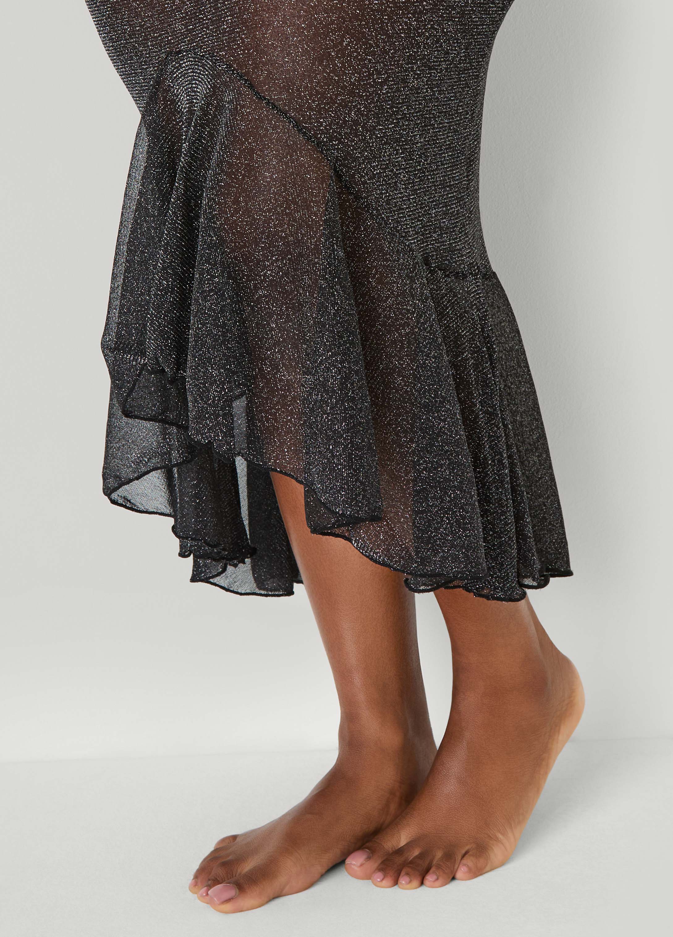 • Metallic stretch-mesh maxi slip dress with adjustable shoulder straps and mermaid hemline. Unlined. Slip-on style.