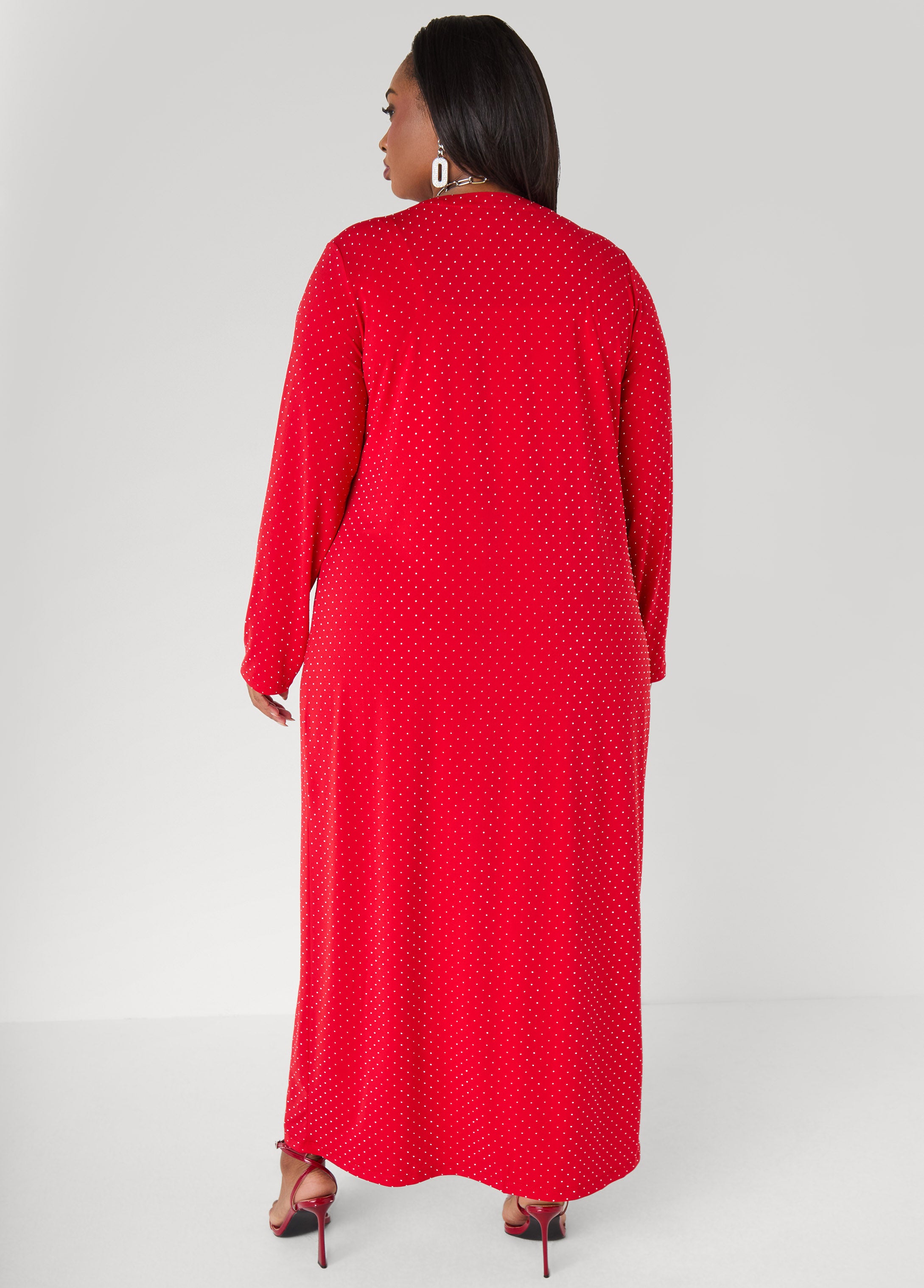 Long, sleek and ready to show off. This studded duster layers on shine with an open-front shape that moves with you. Throw it on with the matching cami for a two-piece set that brings attitude and a little sparkle your way.