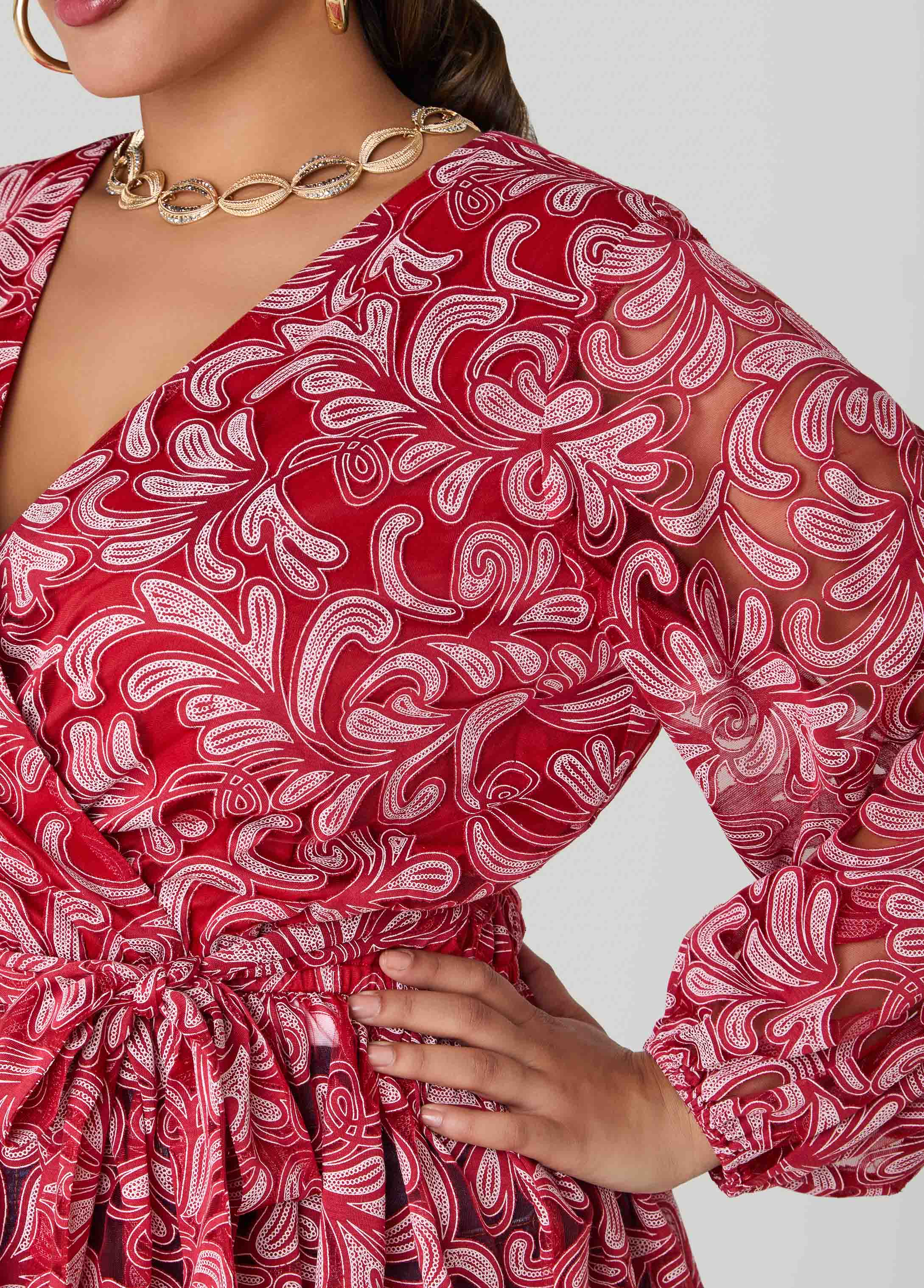 This paisley mesh top wraps in style with a faux wrap front and sash-tied waist.