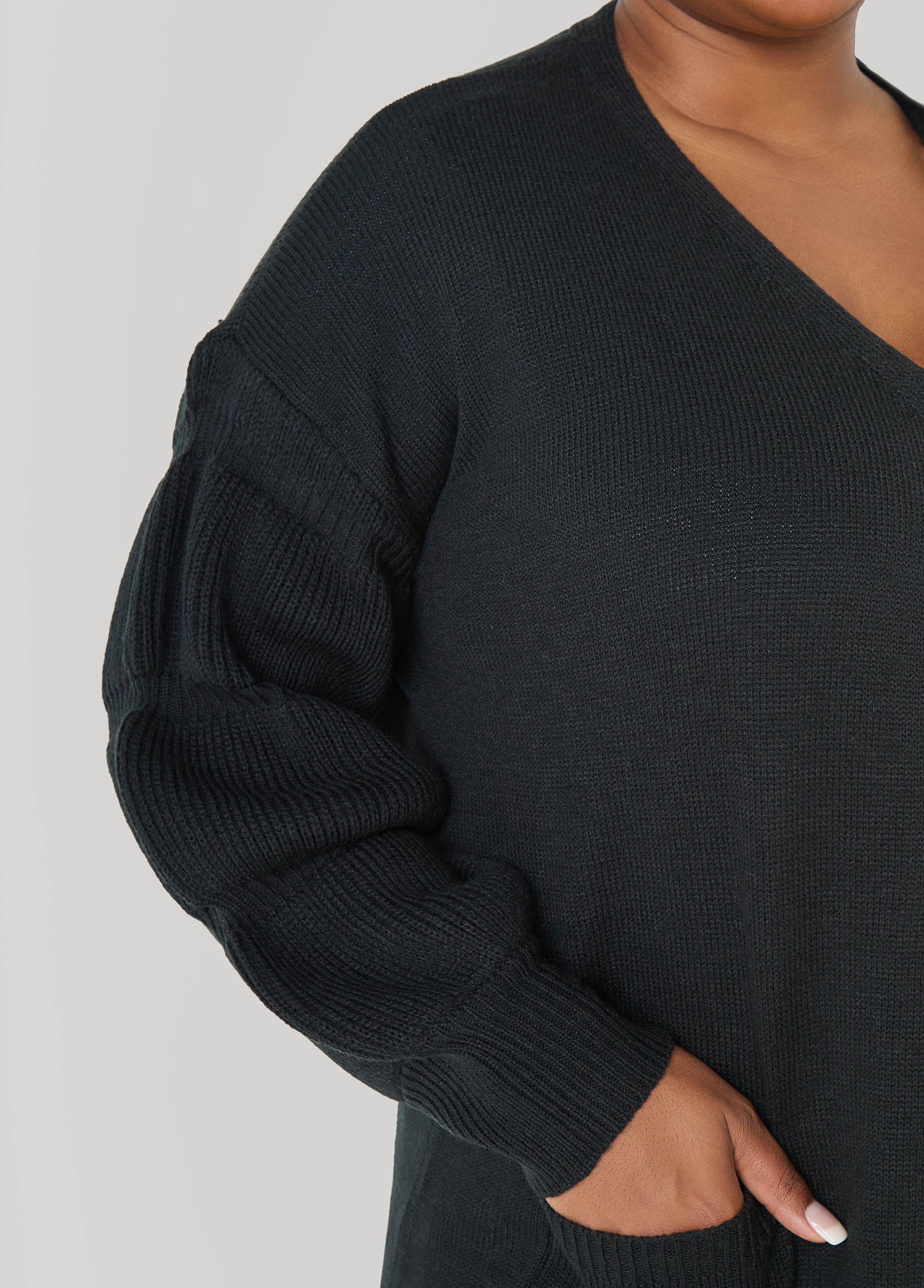 Our knitted cardigan with puff sleeves and front patch pockets for that's both fun & fashionable.