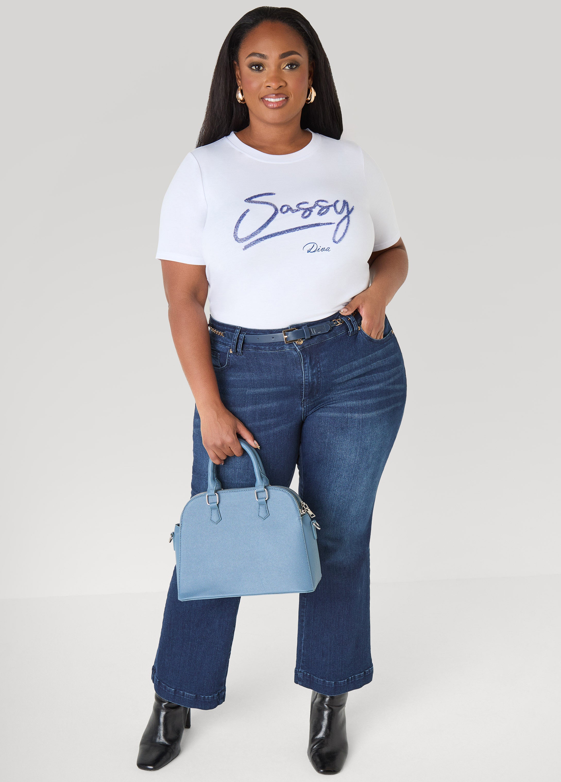 A classic jersey tee turns up the personality with “Sassy” spelled out in beads and “Diva” stitched in embroidery. Equal parts attitude and shine, it’s made for days when subtle just isn’t the mood.
