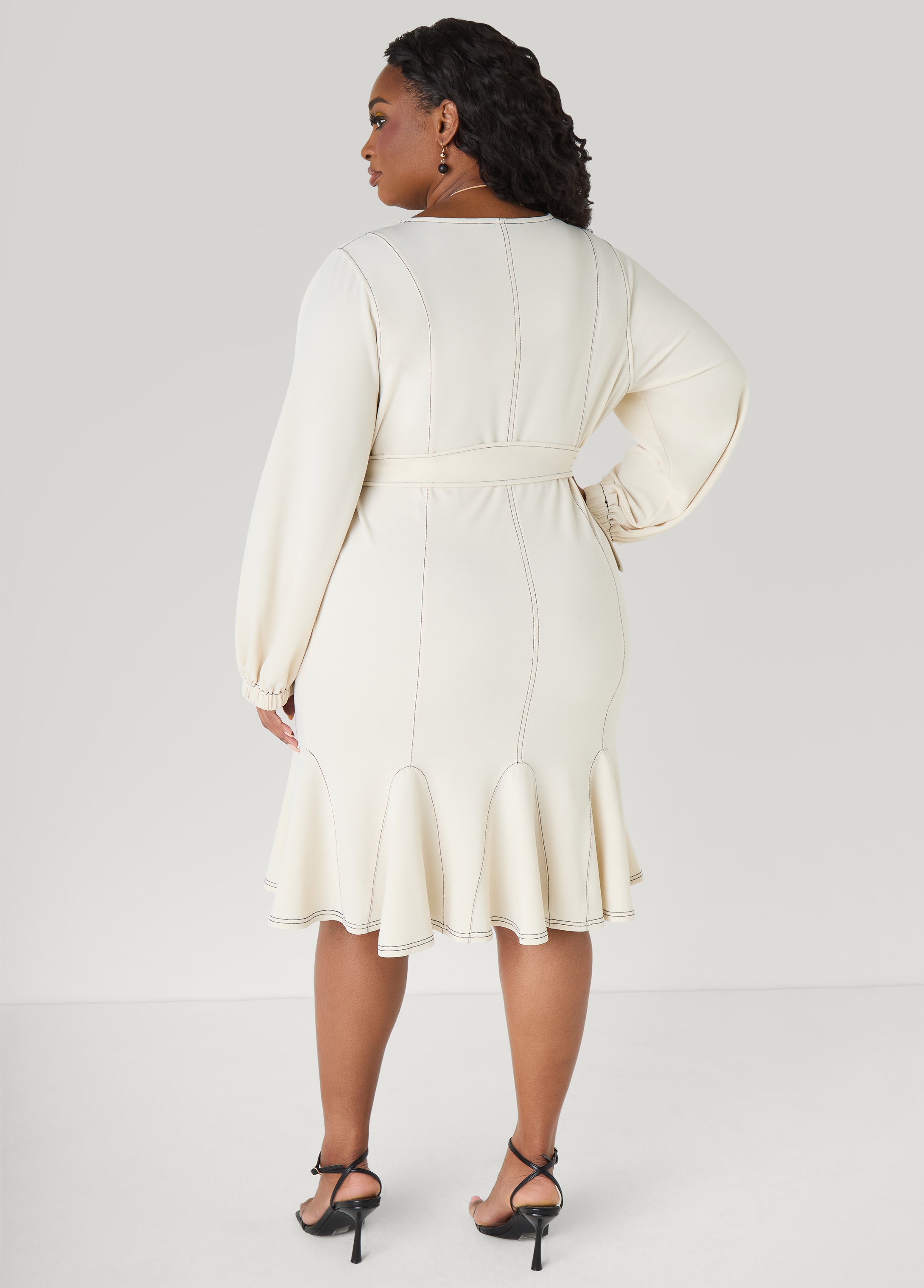 This crepe dress features a clean V-neck and softly shaped sleeves with elasticized cuffs. Thoughtful seam detailing creates dimension along the silhouette, complemented by a D-ring belt at the waist and a flounced hemline.