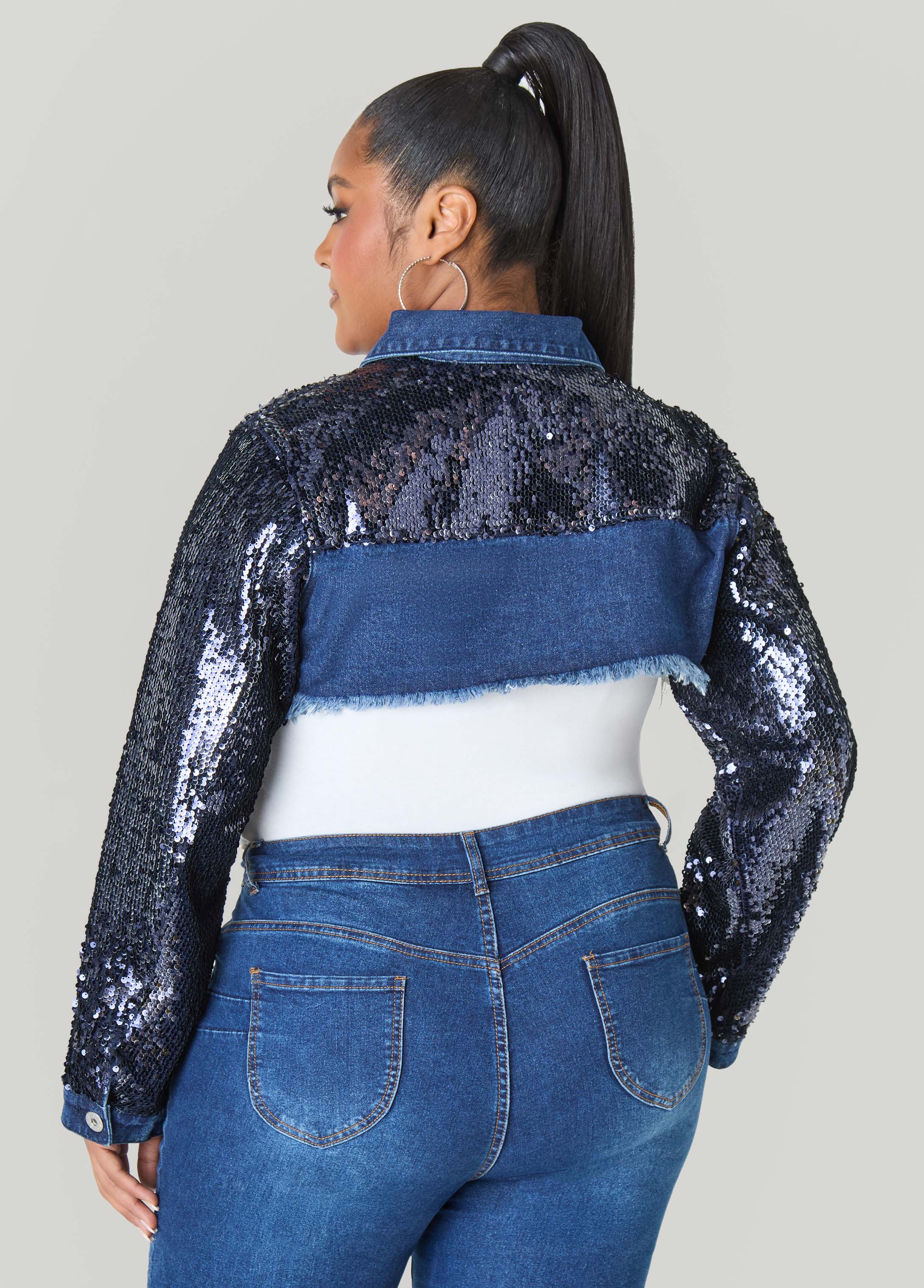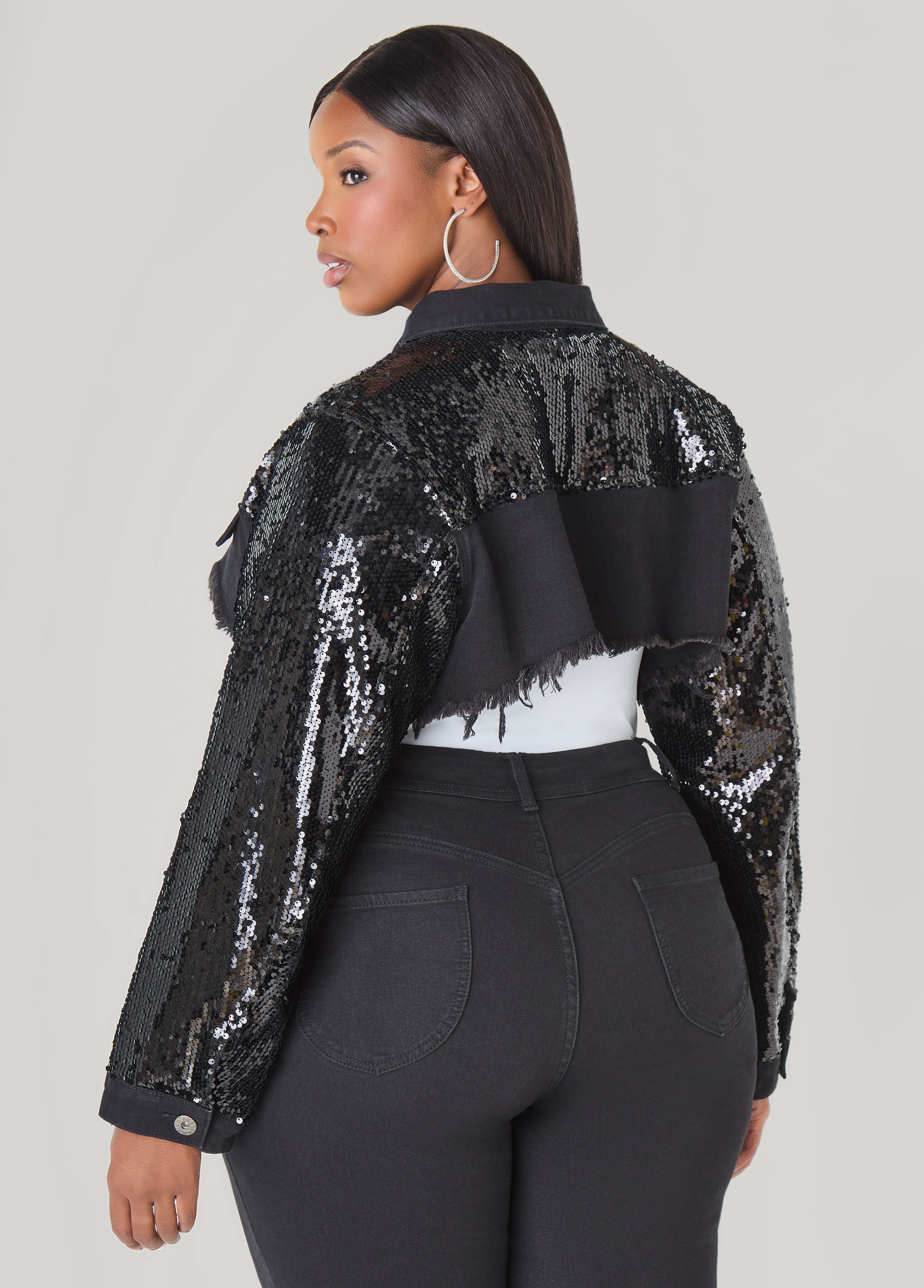 Denim, but make it party. This cropped jacket lights things up with allover sequins and faux pockets at the bust for that just-right mix of casual and glam.