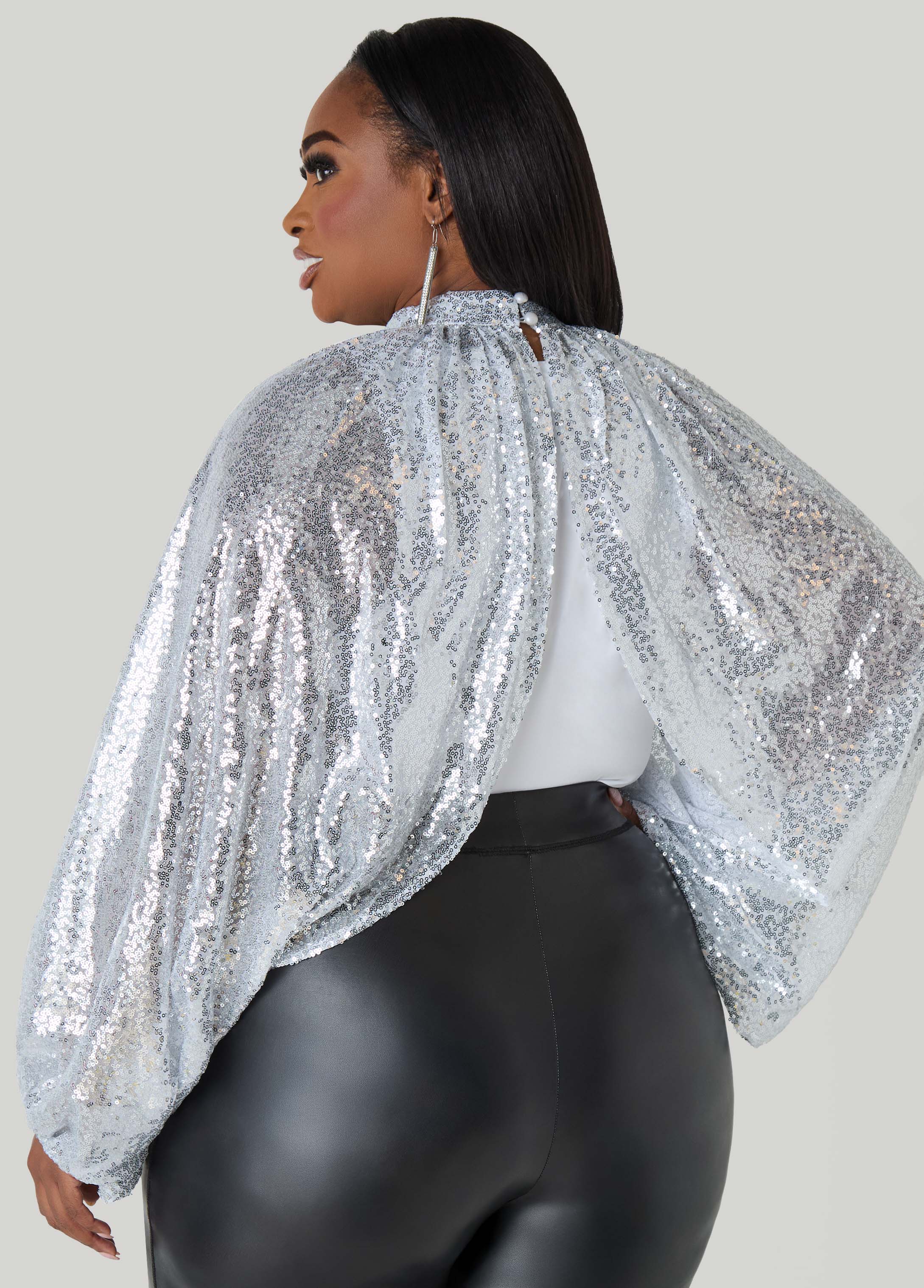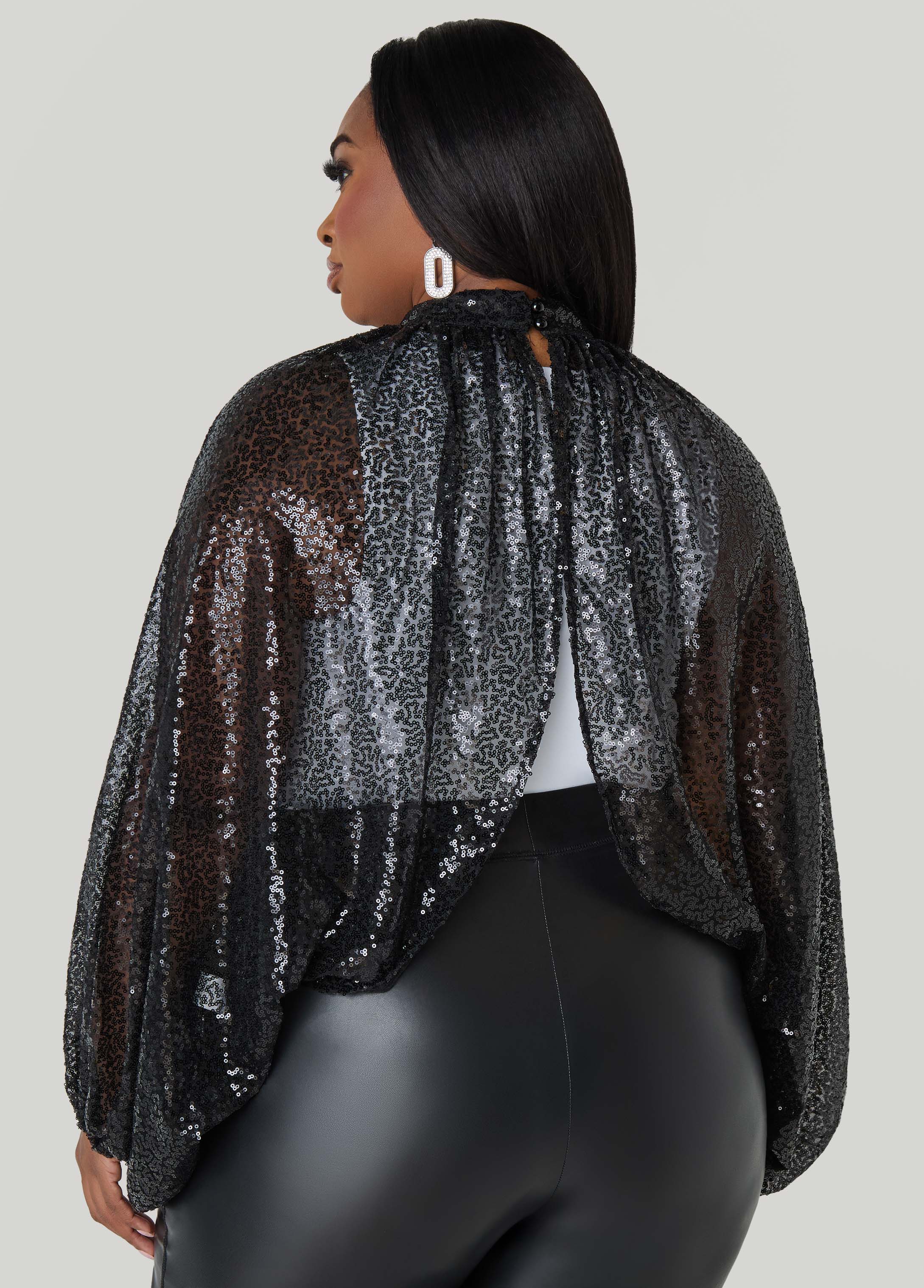 Light up the season in this mesh shrug. Sequins sparkle across front and back splits, while elasticized cuffs add a playful, ready-to-dance finish.