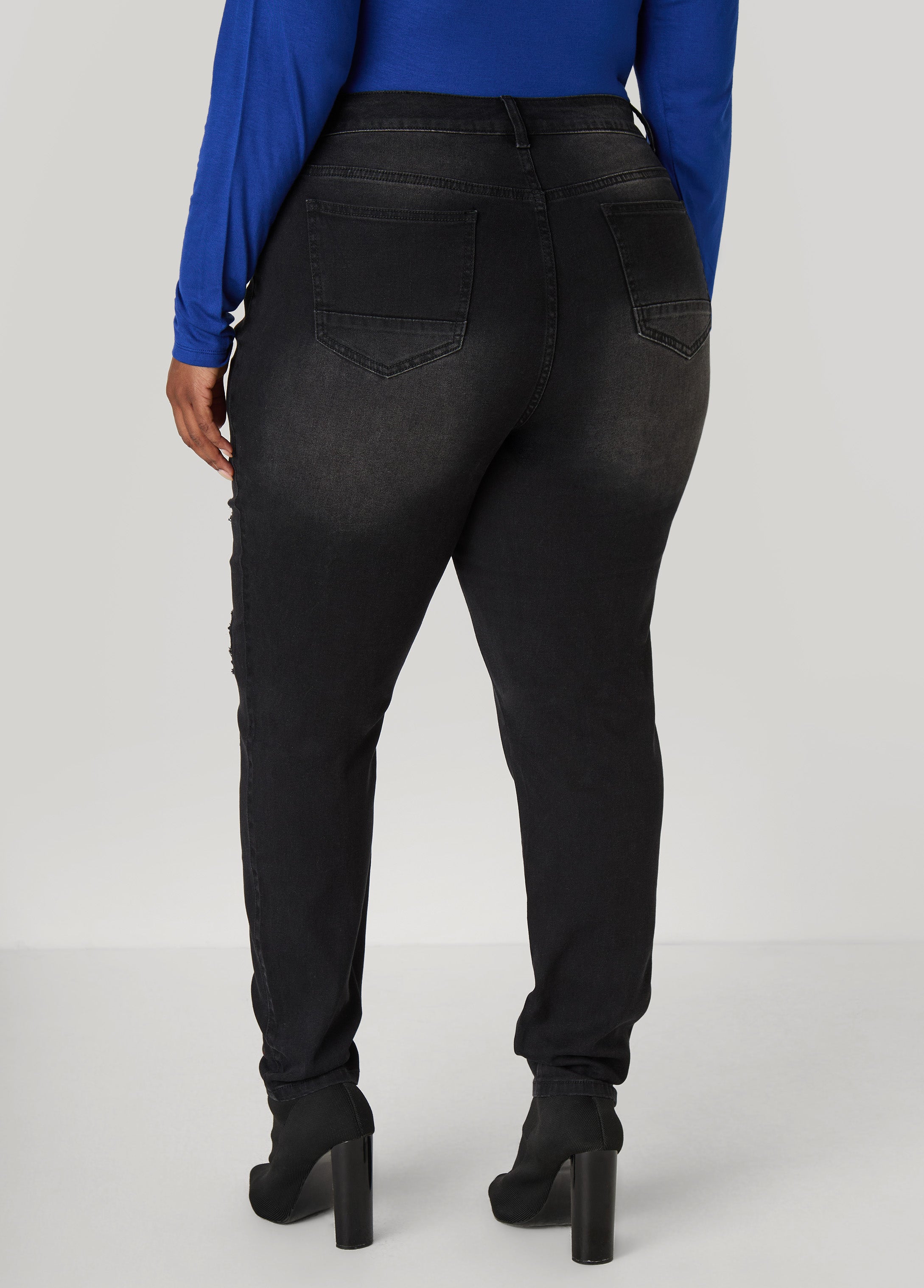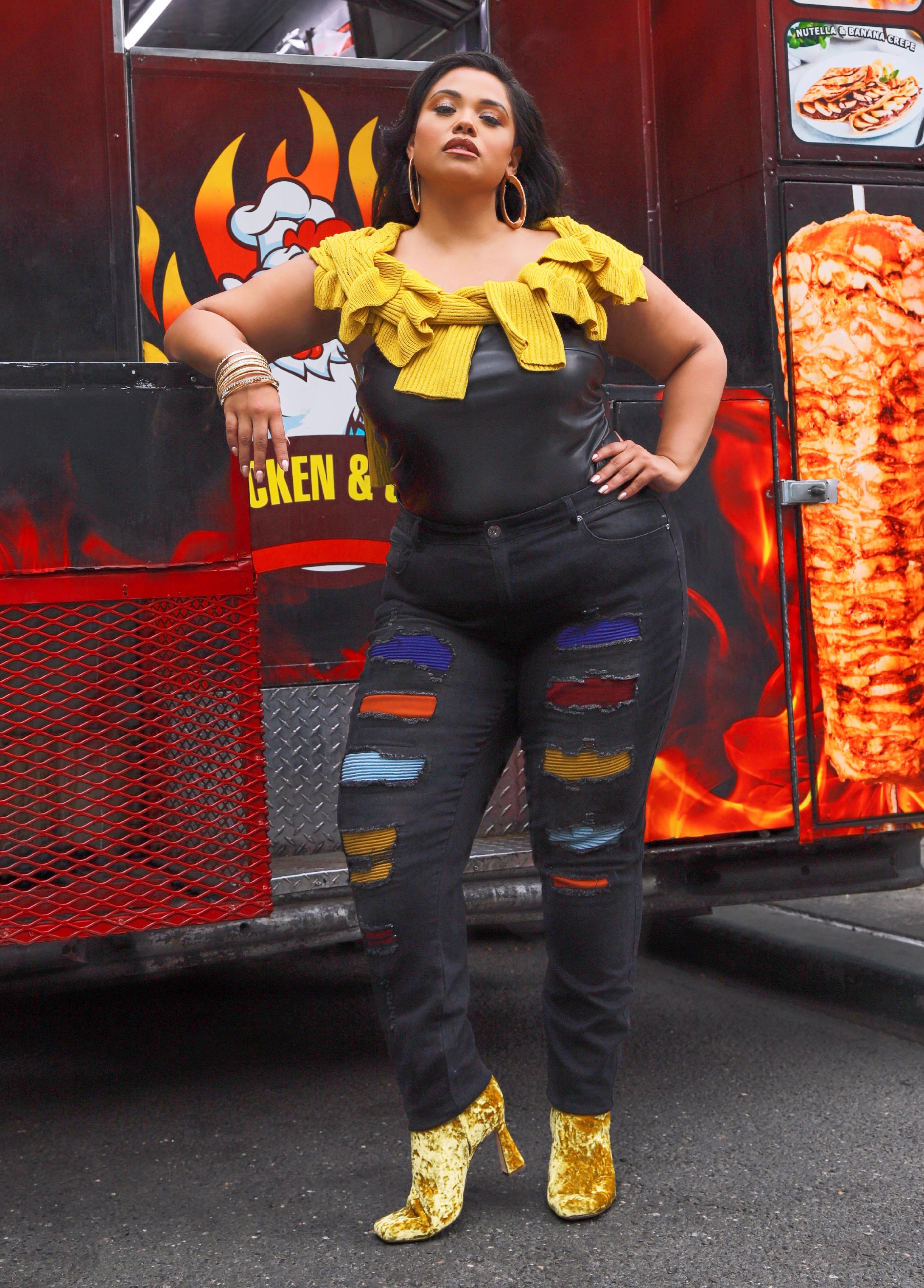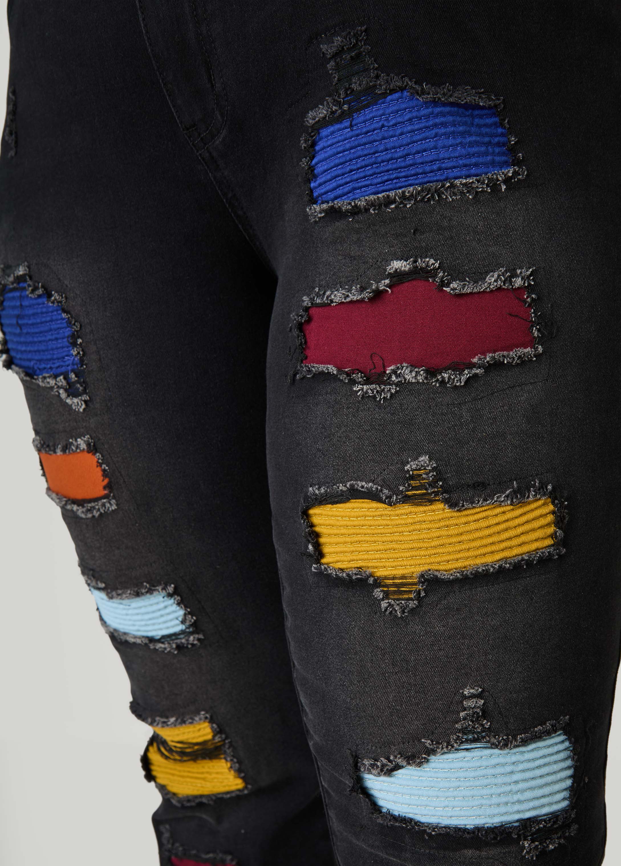 Ribbed burst of colors peek through the distressed cutouts of these skinny jeans that you can imagine styling in so many ways that will never get boring.