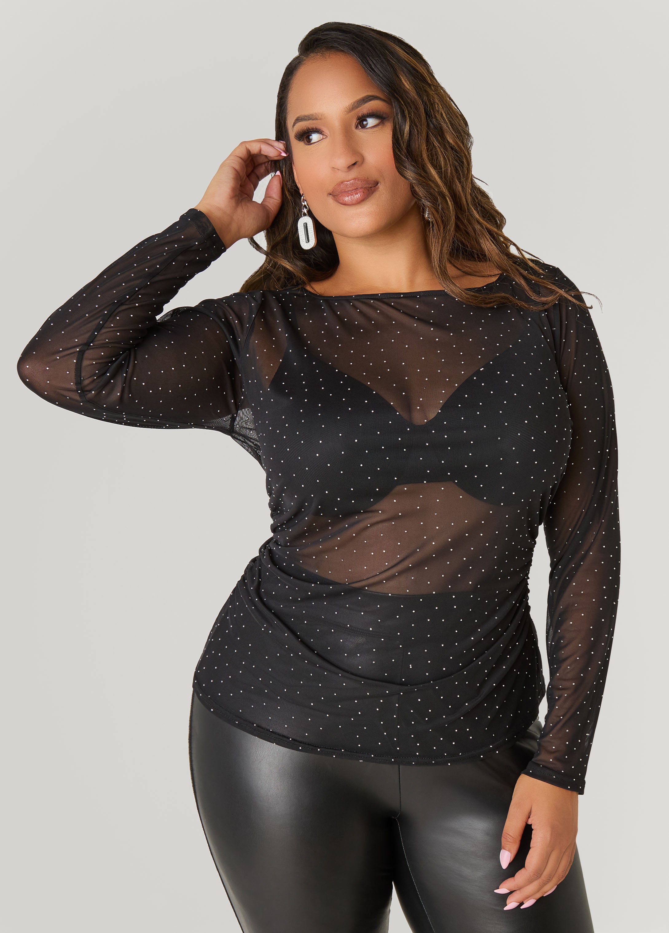 Sheer mesh clings close to the body of our long-sleeved top scattered with silvery studs that’s unapologetically daring.