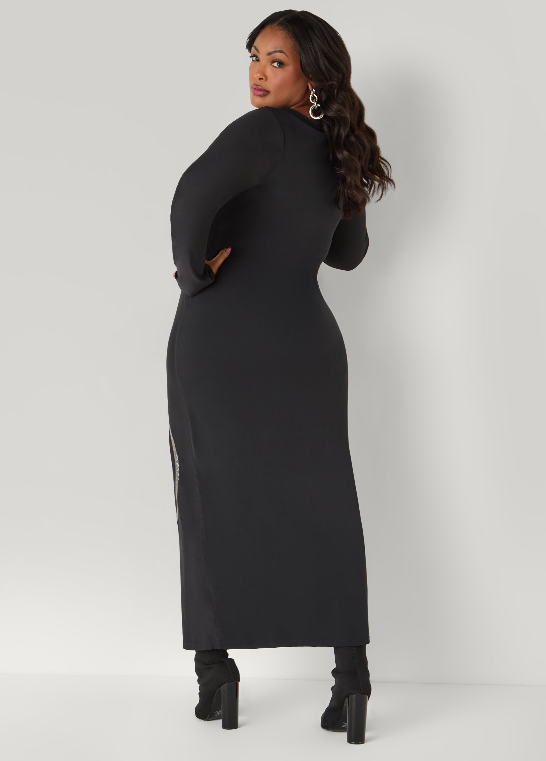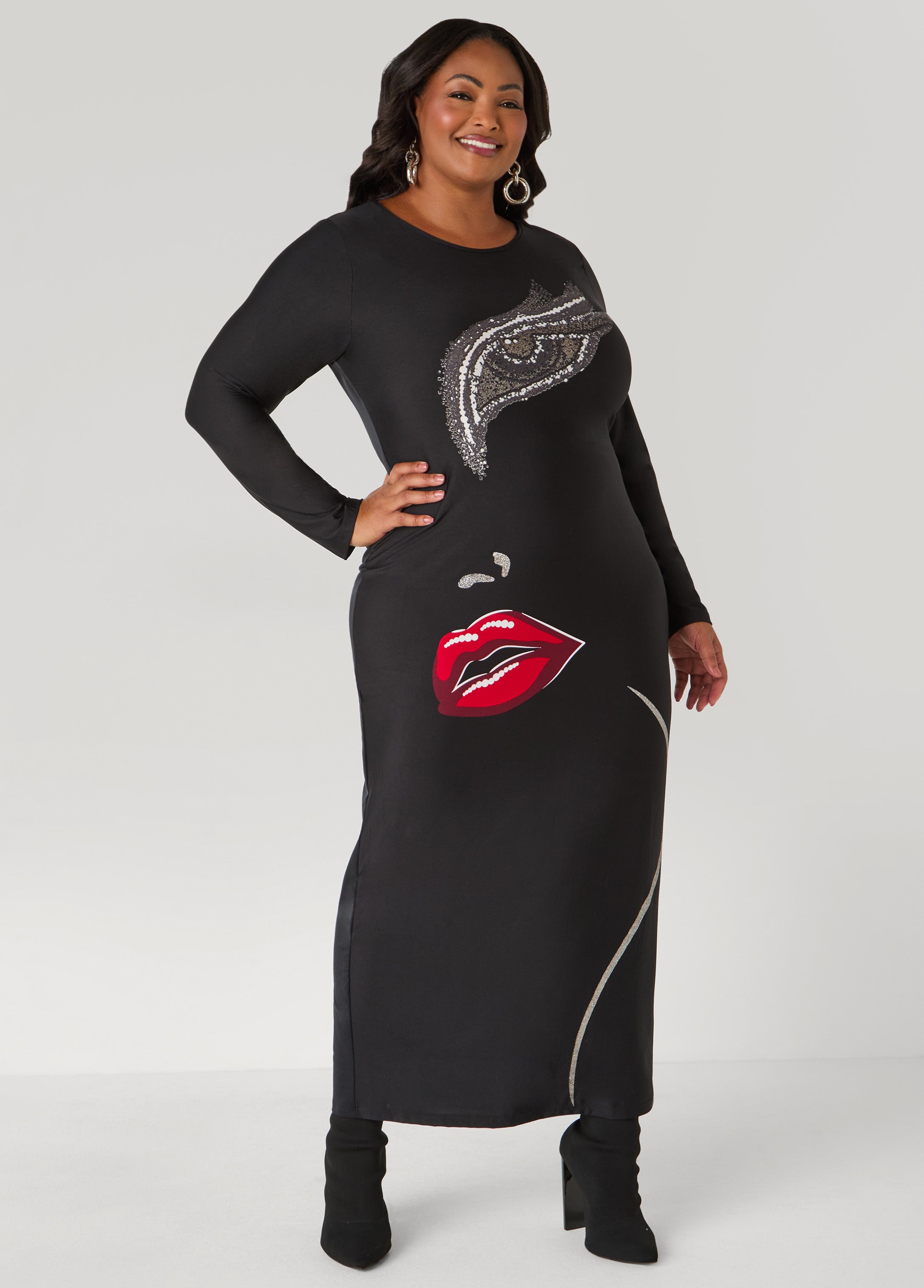 All eyes on you. This stretch-knit maxi serves a glittered face graphic made for to party.