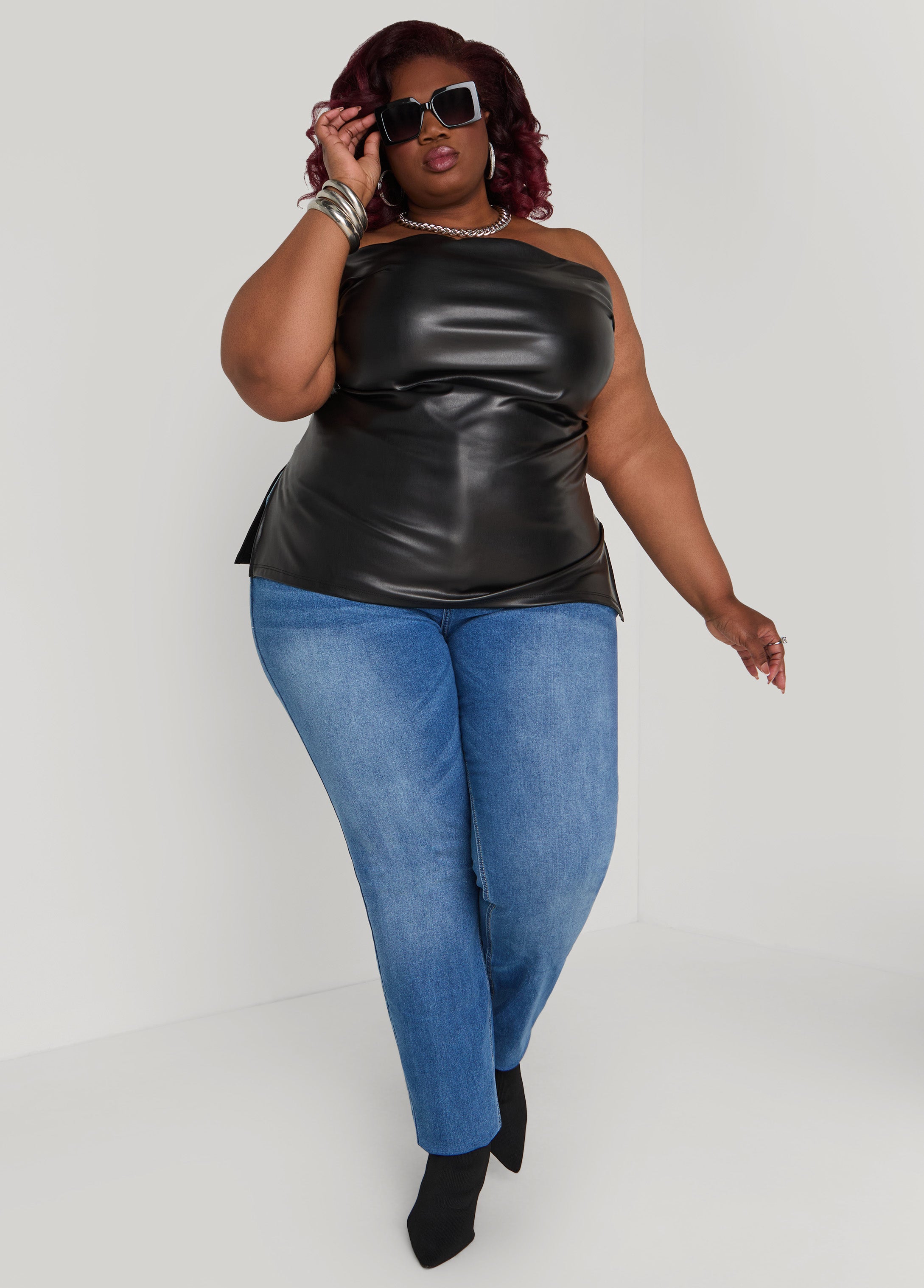 Faux leather gets flirty with ruched sides, an elasticized bustline and daring side splits on our sexy tube top.