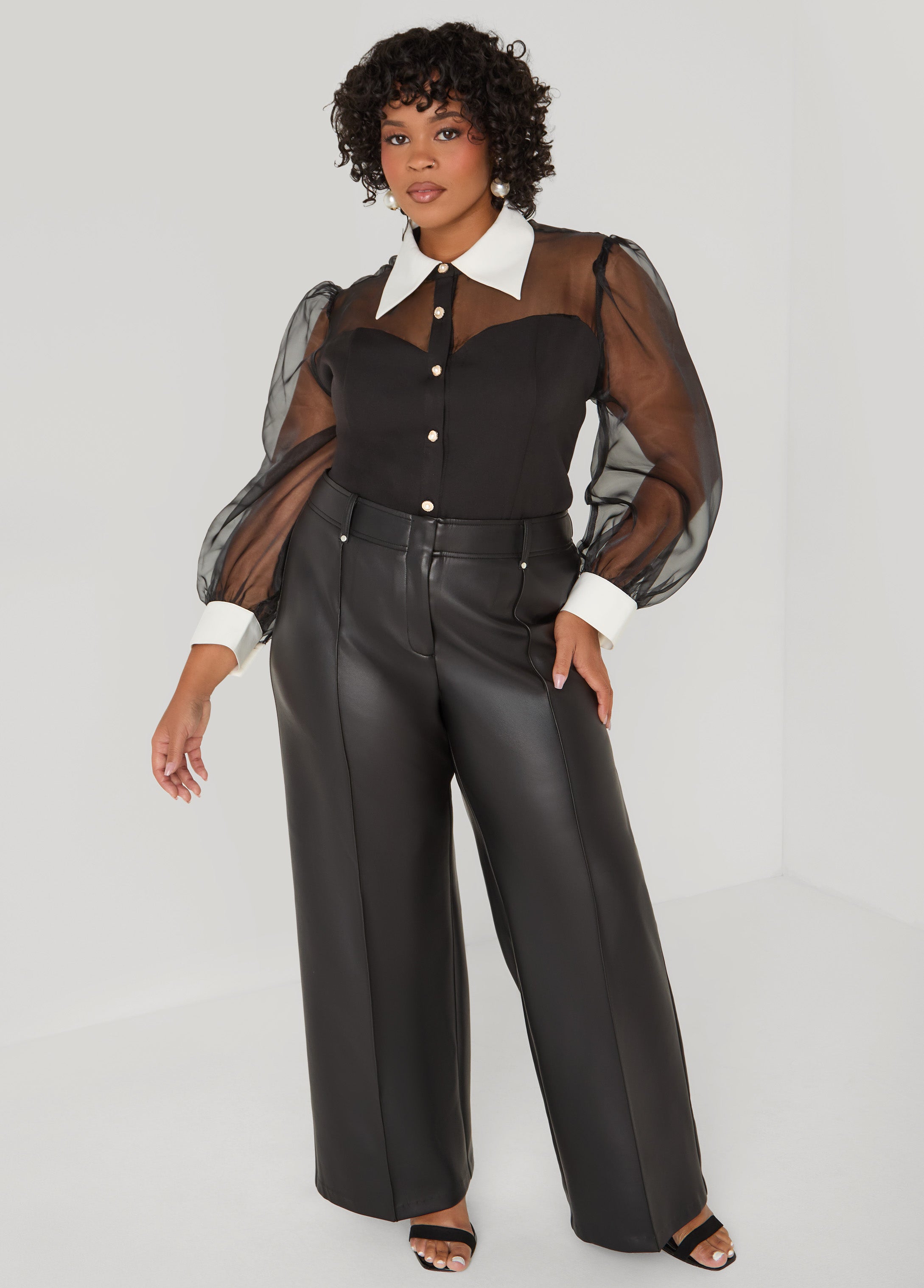Corset curves, sheer tease. Our stretch-crepe shirt is laced with corset detailing, organza panels and finished with faux pearl buttons.