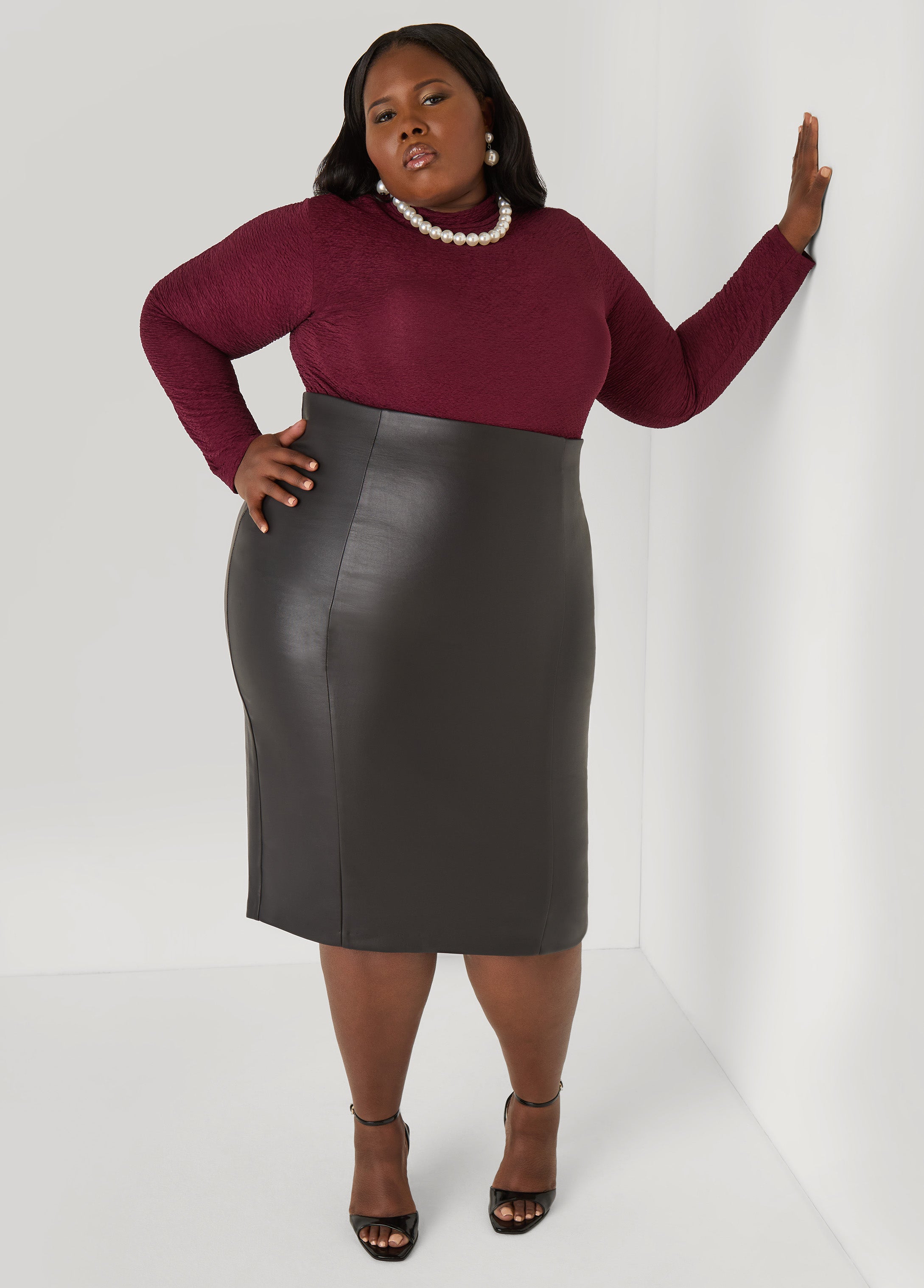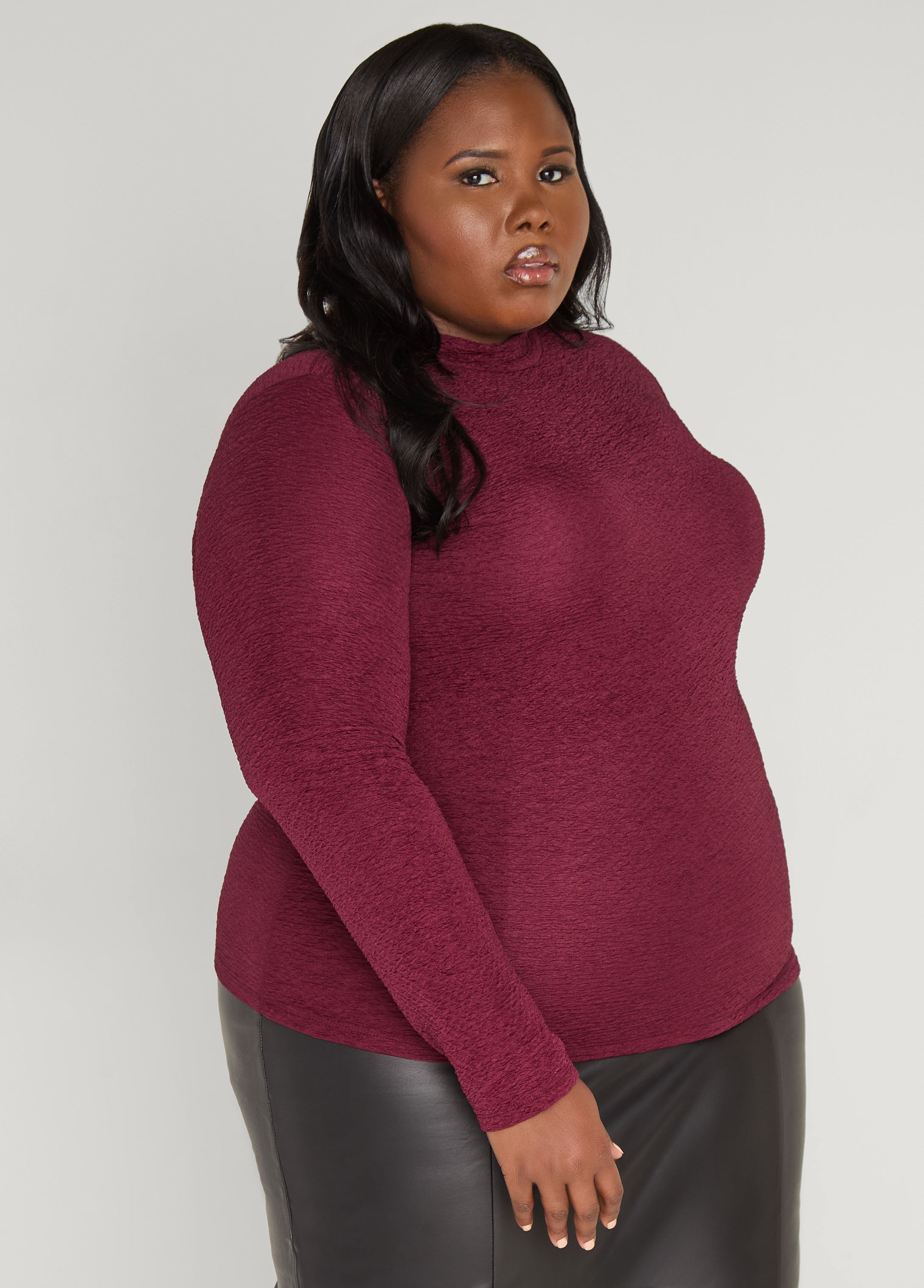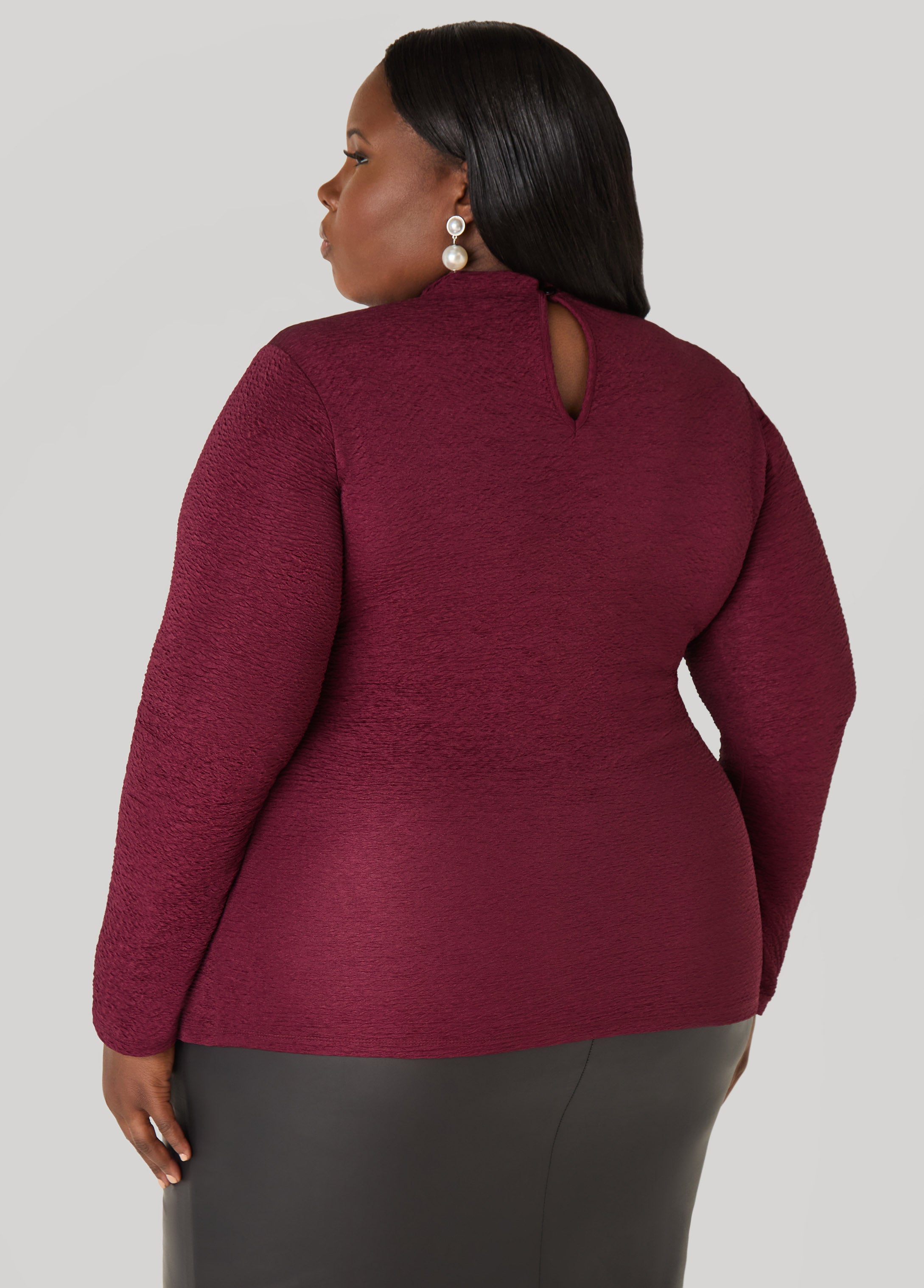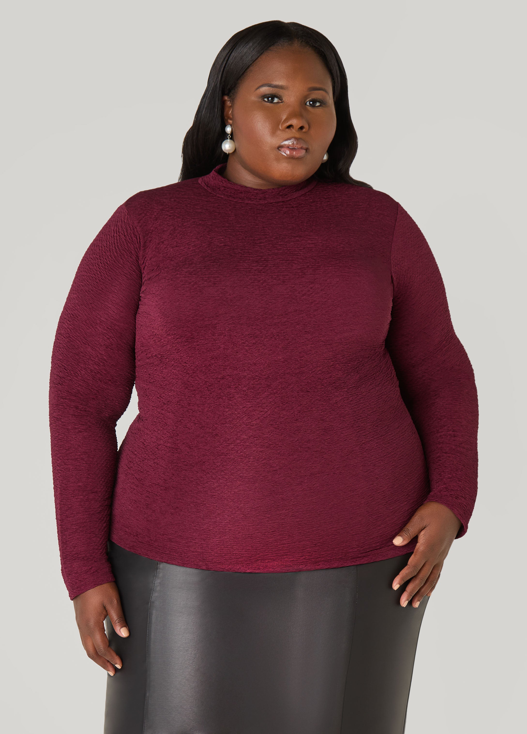 This top pairs a sculpted mock neckline with a rich textured knit. A simple silhouette with elevated detail.