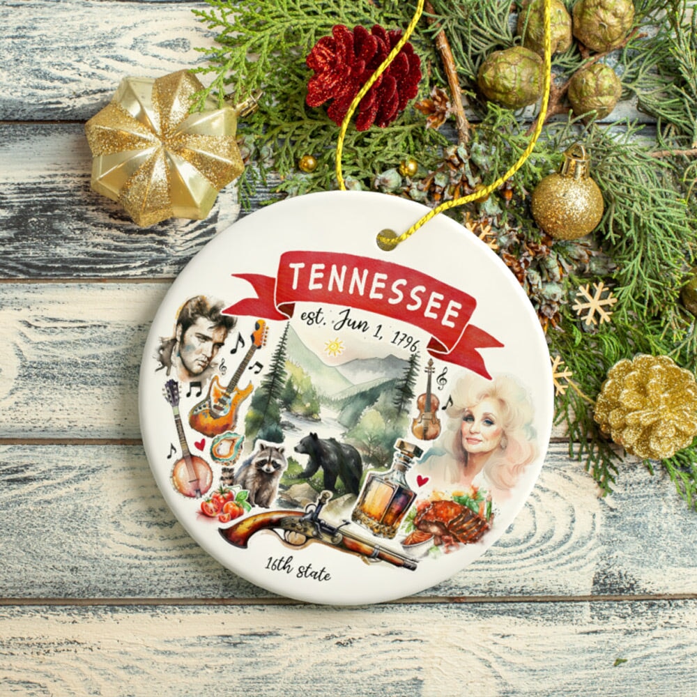 Bring a touch of Tennessee charm to your Christmas tree with our Artistic Tennessee State Themes and Landmarks Christmas Ornament! Featuring the iconic landmarks and symbols of the Volunteer State, this ornament is a perfect way to show your love for Tennessee. With its vibrant colors and intricate details, this ornament features the popular musical icons, Great Smoky Mountains, raccoon, and agate—all symbols that represent the beauty and culture of Tennessee. Crafted with high-quality materials, it is sure to become a treasured keepsake for years to come. Celebrate the history and spirit of this great state with our Artistic Tennessee State Themes and Landmarks Christmas Ornament!