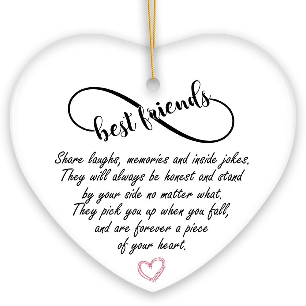 Celebrate the unbreakable bond of friendship with this heartfelt ornament, perfect for best friends who share countless memories, laughter, and loyalty. Designed in a charming heart shape, the ornament beautifully expresses the irreplaceable role your friend plays in your life always there to lift you up, share honest moments, and forever be a piece of your heart. A sentimental and timeless keepsake, this ornament captures the essence of true friendship, making it a meaningful gift for your lifelong partner in crime.