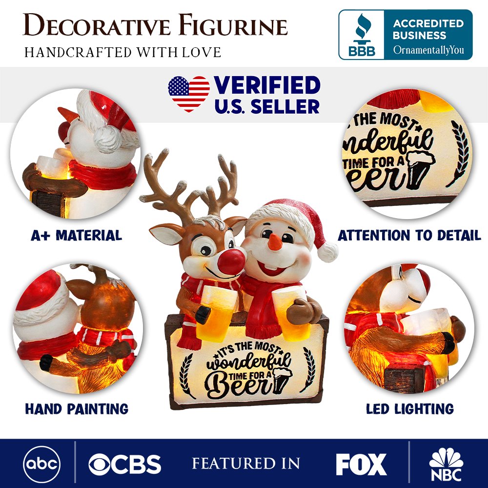 Get into the holiday spirit with this festive snowman and reindeer figurine, perfect for Christmas party lovers! Featuring a joyful snowman and his reindeer pal, both celebrating the most wonderful time of the year with a beer in hand, this playful holiday decoration brings laughter and cheer to your home or garden. Whether it's displayed on your tabletop or amidst your holiday decor, this charming statue adds a fun twist to traditional Christmas themes. It's a quirky conversation starter for guests at your festive gatherings!