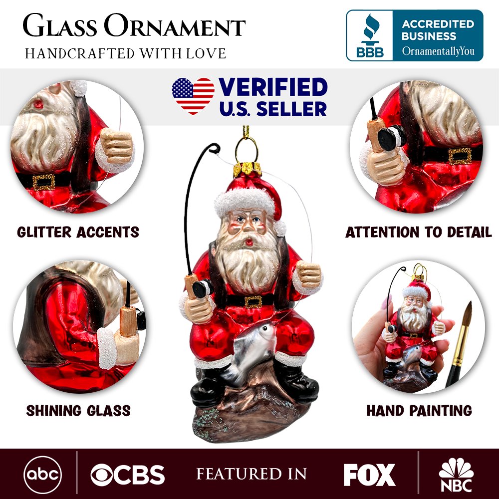 Santa's got a new hobby! Gone are the sleigh bells and reindeer for the day—he's kicked back by the river, casting lines instead of delivering toys. This jolly fisherman knows the true meaning of relaxation, making it the perfect ornament for those who love fishing, nature, or just a good laugh. Skillfully hand-blown with intricate details, this piece is a whimsical nod to the quiet joys of unwinding. Fun fact: even Santa deserves a break after the holiday rush, and there's nothing quite like a quiet day with a fishing rod in hand!