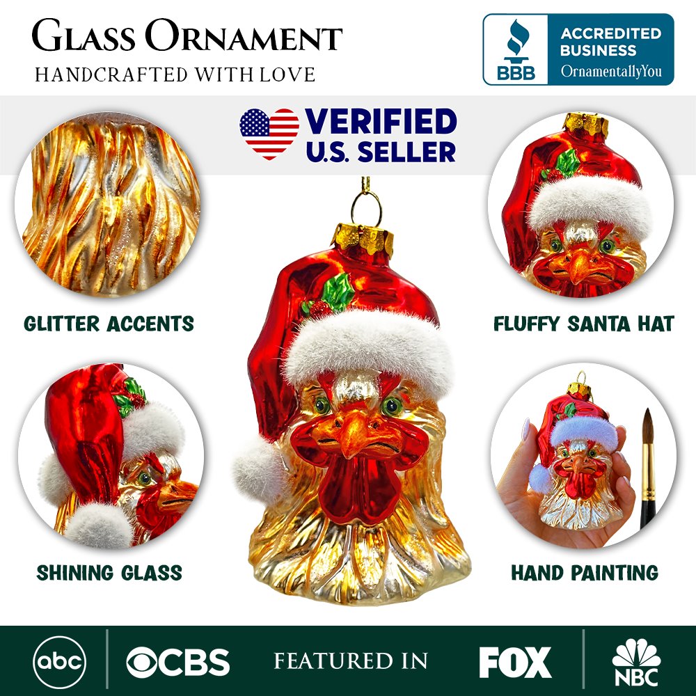 Celebrate the holidays with a charming handblown glass Christmas ornament featuring a festive rooster donning a Santa hat, perfect for farm-themed or rustic holiday decor. This artisan-crafted ornament adds a whimsical touch to your Christmas tree or seasonal displays with its vibrant colors and intricate detailing. Ideal for poultry enthusiasts and collectors alike, this unique ornament blends traditional holiday cheer with rustic charm, making it a delightful addition to any festive setting. 🎄🐔