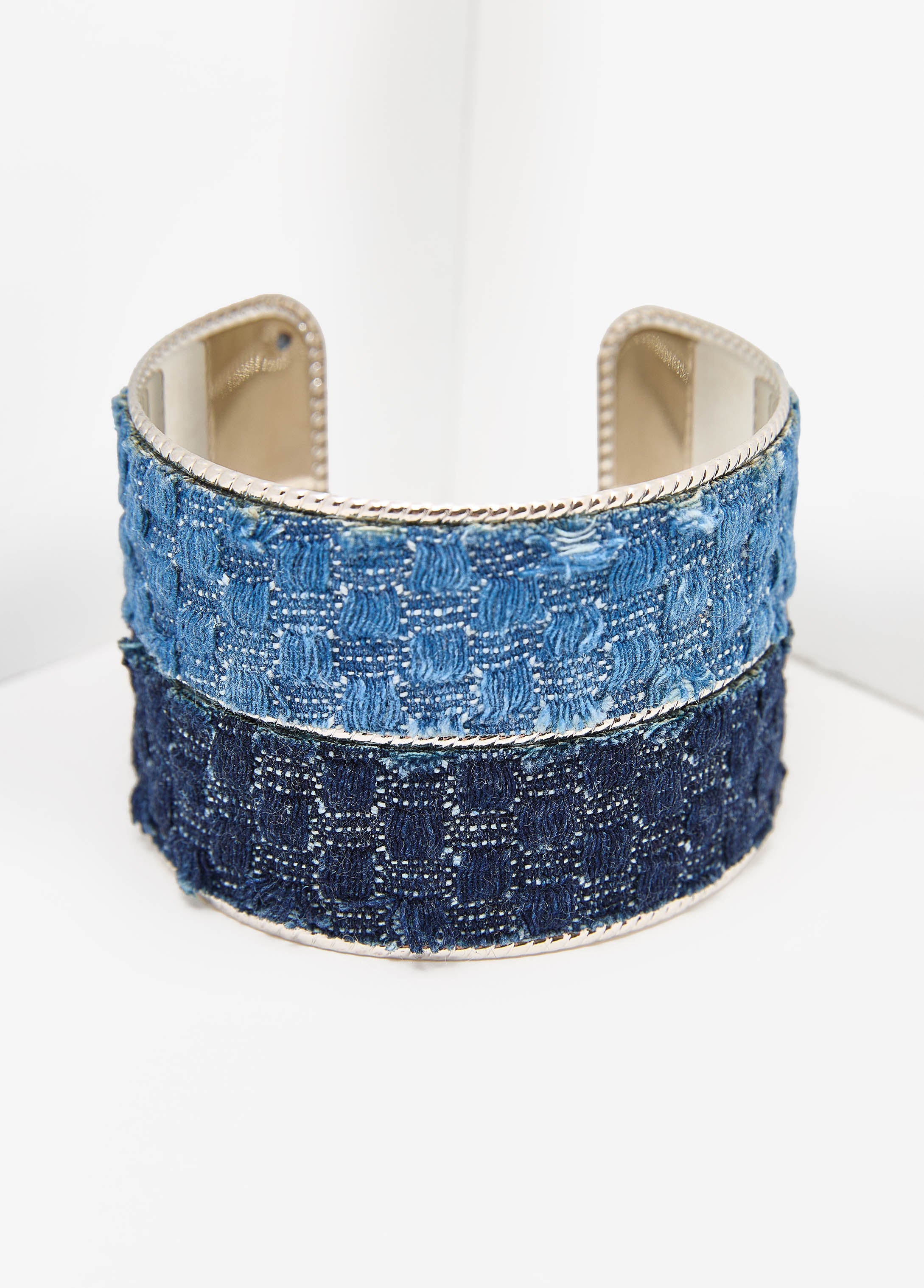 Our cuff has range thanks to the two-tone quilted denim set in sleek silver metal so you serve a look from every angle.