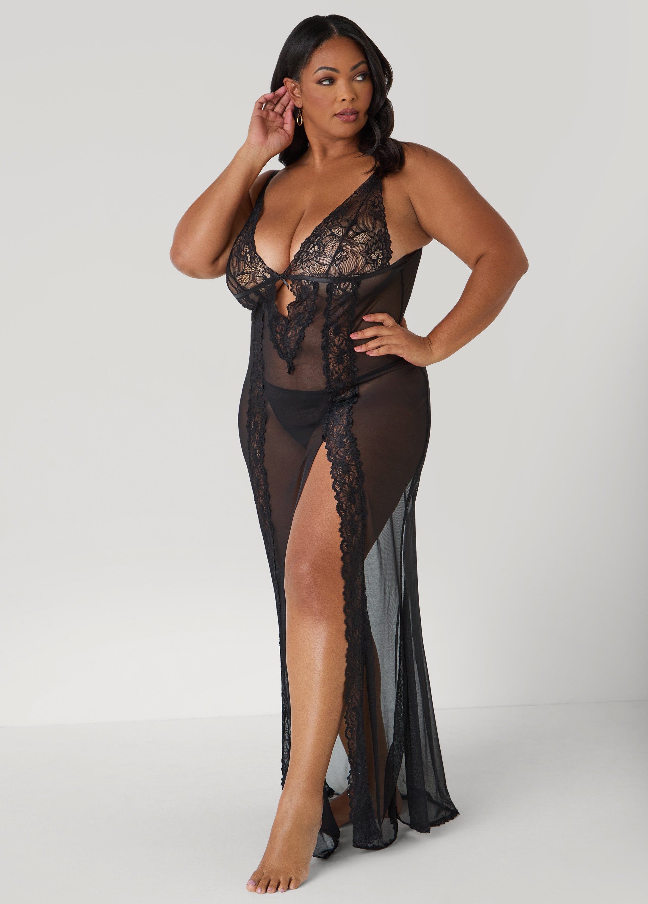 This floral lace and mesh gown doesn’t ask for attention, it takes it. Cutouts front & back, a bold split, satin trims and tie-back fastenings are paired with a sexy thong.