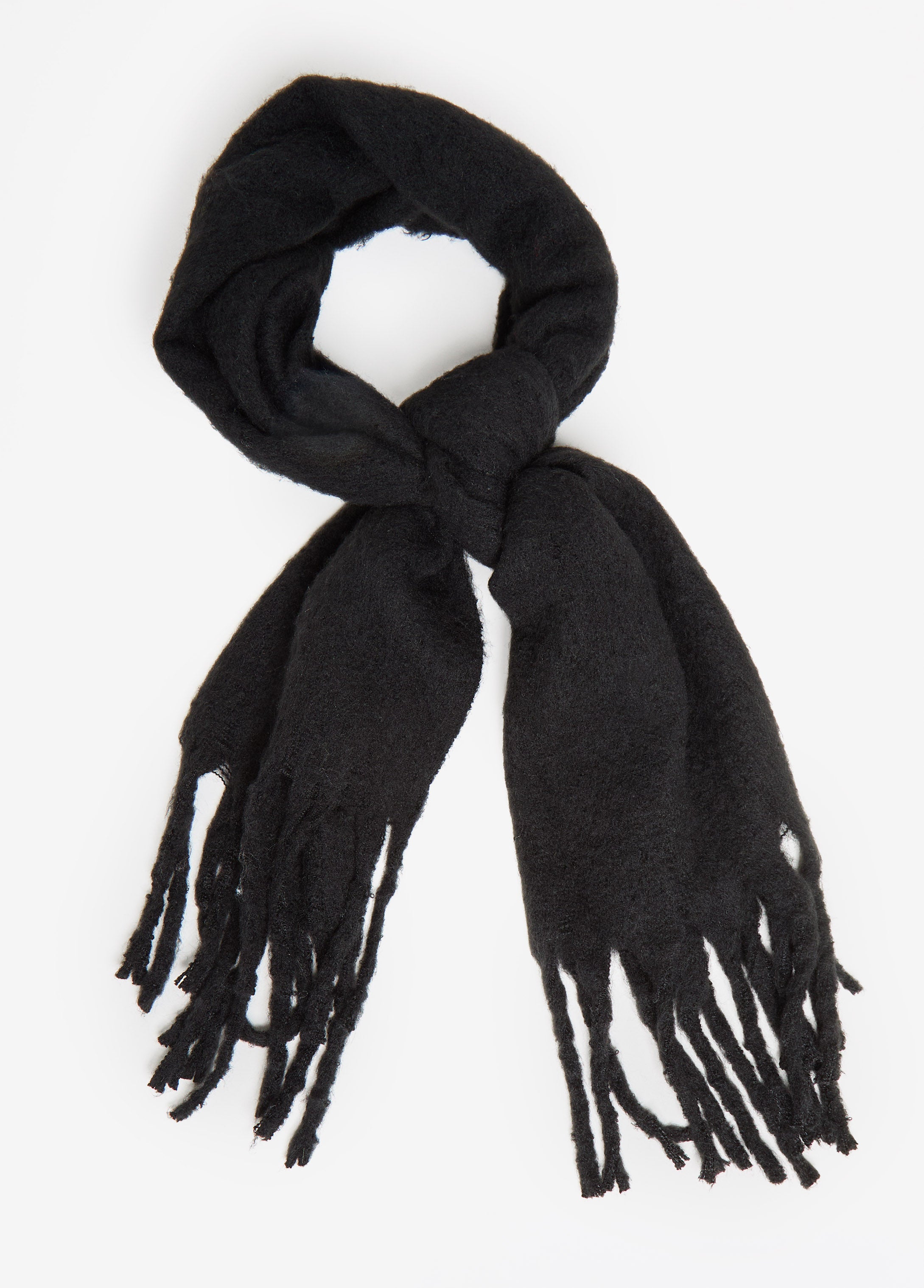 Soft to the touch, warm to the body, add a layer of function to your fashion with this brushed-knit scarf outlined in fringe.