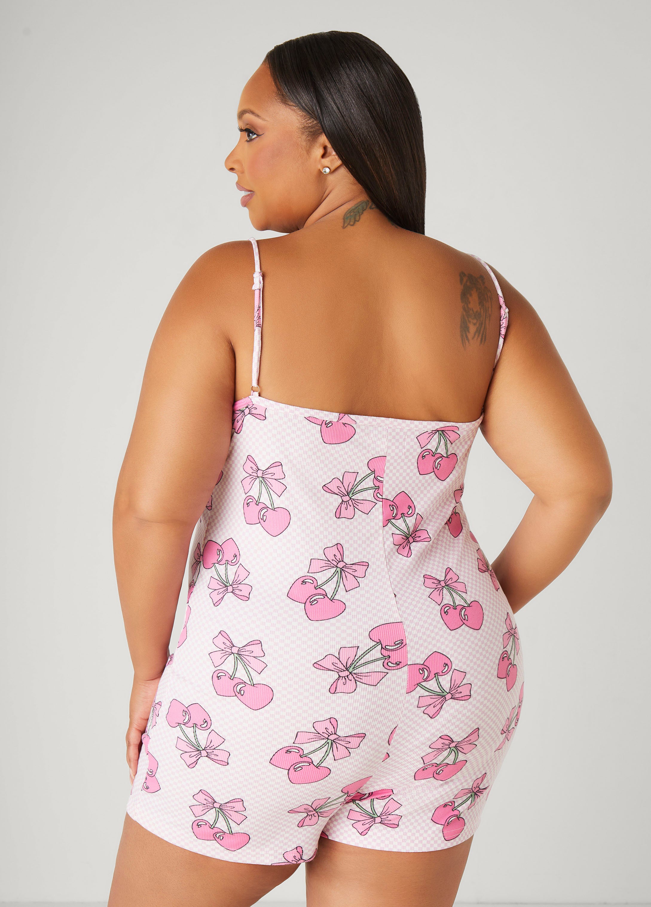 This Love To Sleep romper is cute enough to crush on. Covered in heart-shaped cherries, sweet little bows & a checked print that’s pure pajama party goals, this sleep romper is made for lounging with a wink.