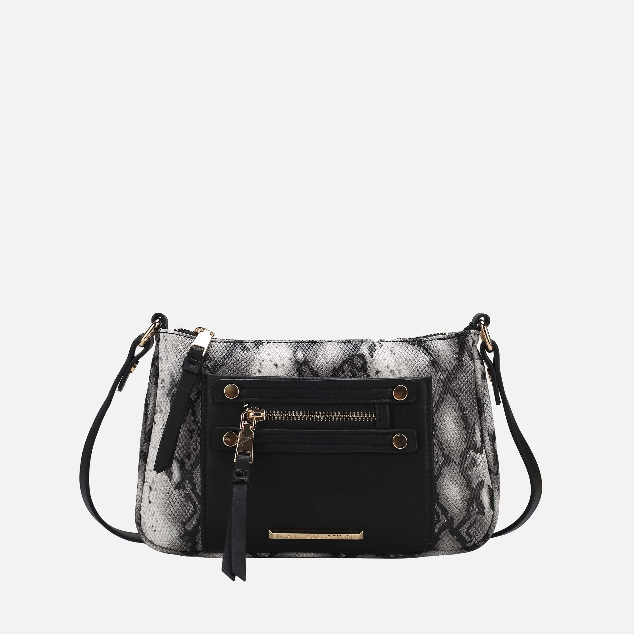 A striking update to a classic shape, the Essie bag is crafted in snake-effect vegan leather with a contrasting panel for an eye-catching design. Gold-tone hardware and an adjustable strap refine the look while a front zip pocket keeps essentials close.