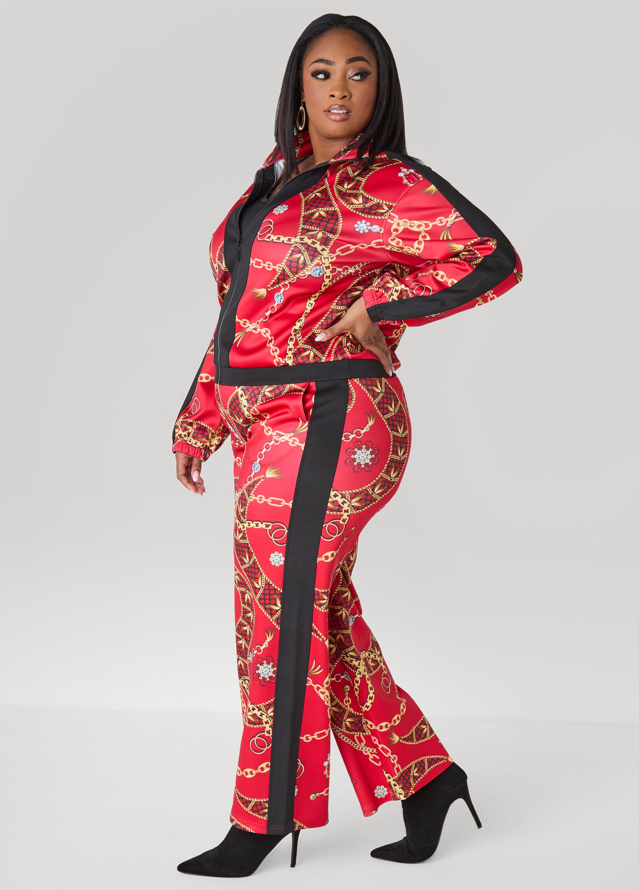 Track star energy only! This status print track jacket brings luxe street flair with elastic sleeve cuffs and a sleek zip front. Pair with the matching pants and serve main character on the move.