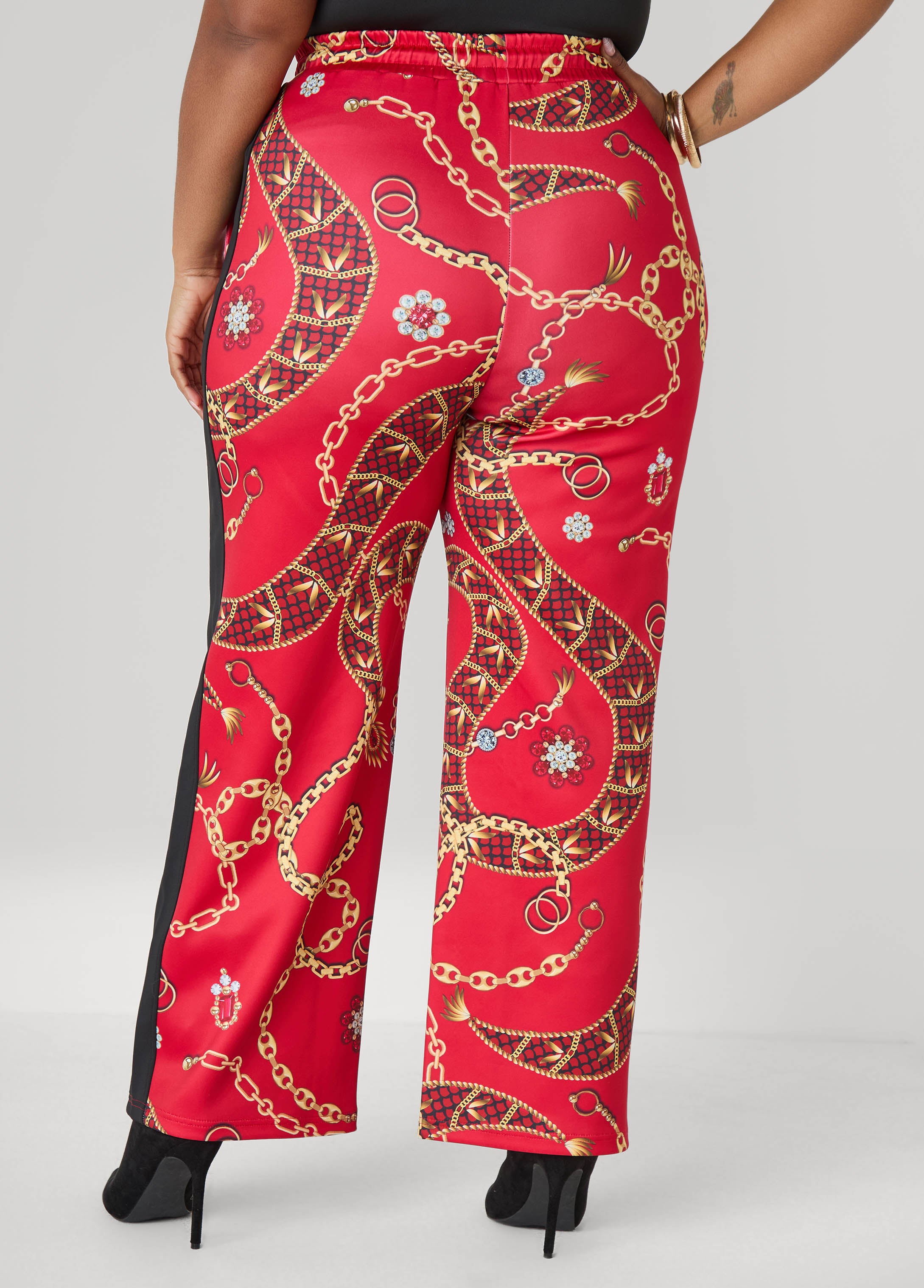 • High-rise status print stretch-knit wide-leg pants with two slit pockets at sides and drawstring at elasticized waistband. Pull-on style. Inseam: 30in. Can be worn as a two-piece set with matching jacket. Jacket sold separately.