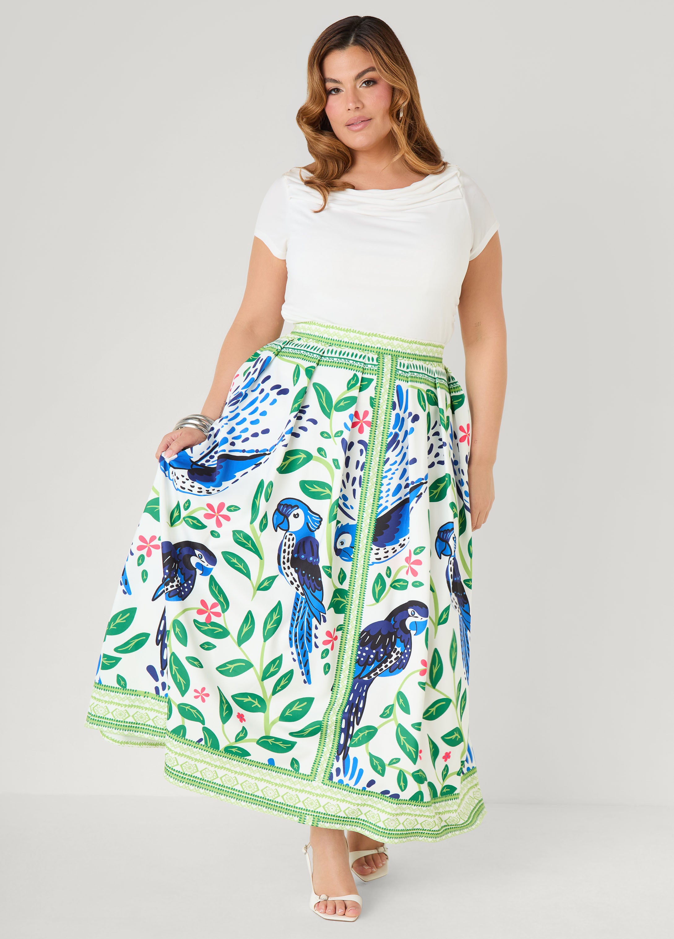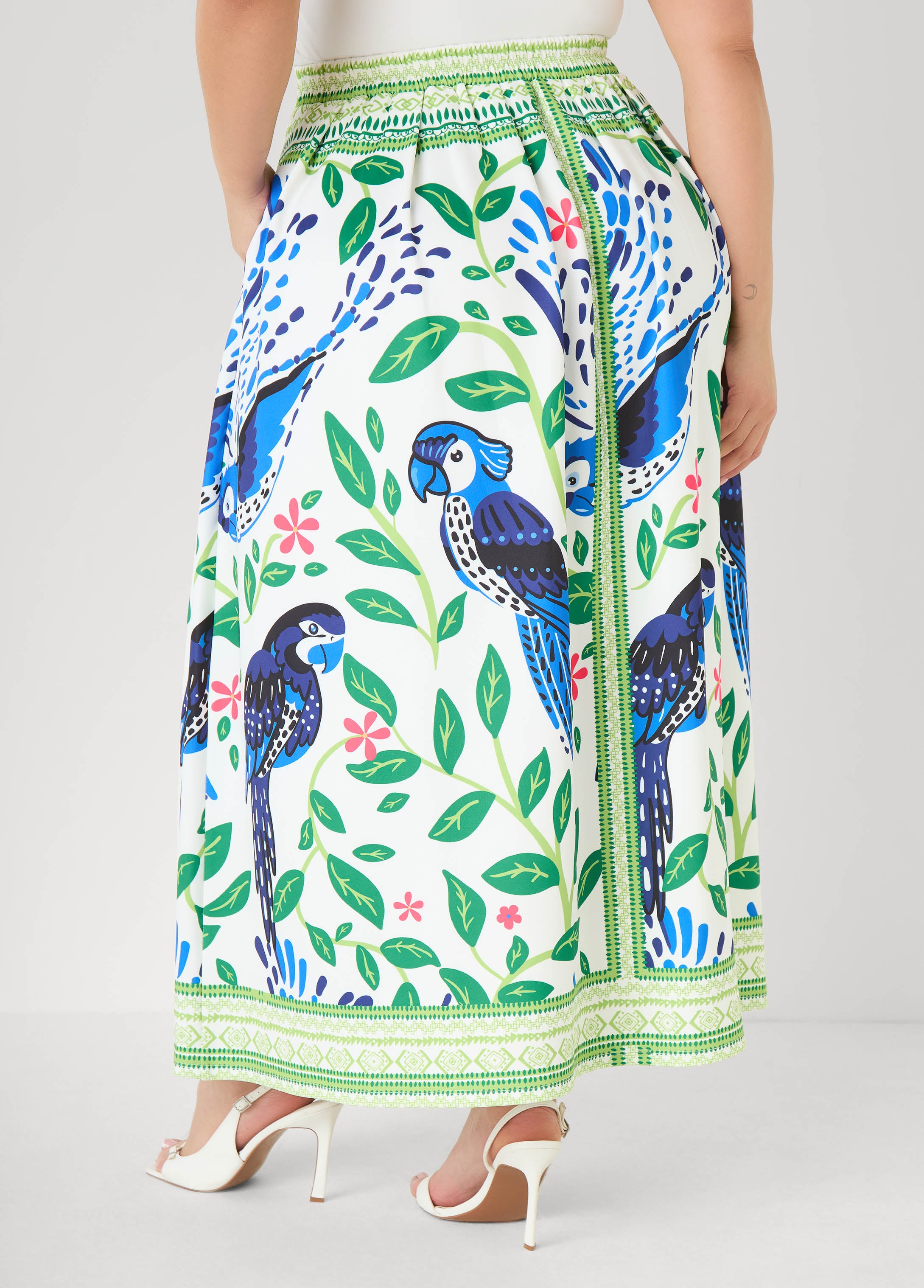 Parrots, florals and rich color are fun details to this pleated maxi skirt. The scuba fabric holds its shape while side slit pockets keep the vibe easy for sunny days, beach strolls and spontaneous plans.